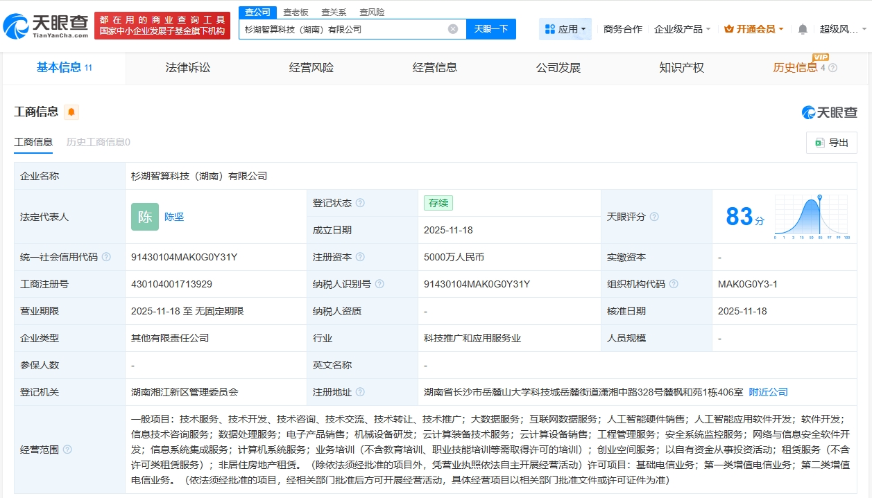 雷达财经讯,天眼查App显示,近日,杉湖智算科技(湖南)有限公司成立,法定代表人为陈坚,注册资本5000万人民币,经营范围包括大数据服务、互联网数据服务、人工智能硬件销售、人工智能应用软件开发等。股东信息显示,该公司由深圳市杉岩数据技术有限公司、长沙曦算科技合伙企业(有限合伙)、湖南大学资产经营有限公司共同持股。