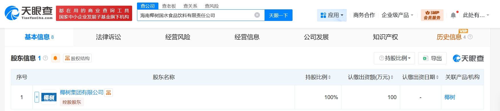 雷达财经讯,天眼查工商信息显示,近日,海南椰树国水食品饮料有限责任公司成立,法定代表人为赵波,注册资本100万人民币,经营范围含饮料生产、食品生产、食品销售、食品用塑料包装容器工具制品生产、食品用塑料包装容器工具制品销售、普通玻璃容器制造等。股东信息显示,该公司由椰树集团有限公司全资持股。