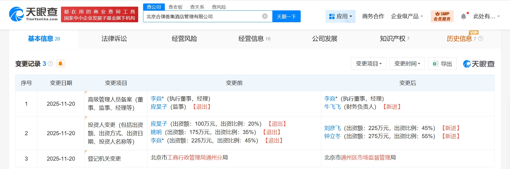 雷达财经讯,天眼查工商信息显示,近日,北京合璞荟集酒店管理有限公司发生工商变更,姚明、应旻子、李焱退出股东行列,新增两位自然人股东,同时,部分主要人员也发生变更。