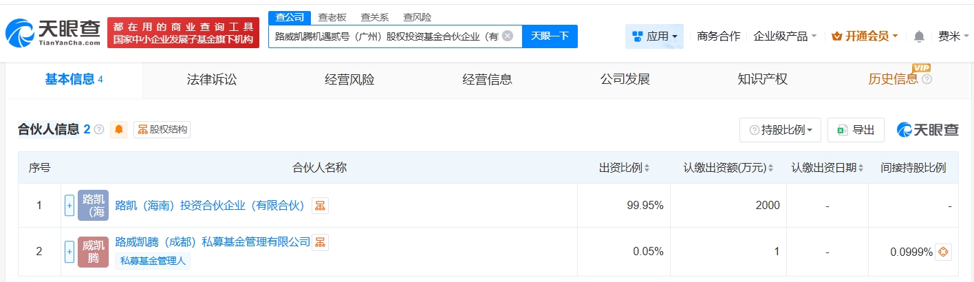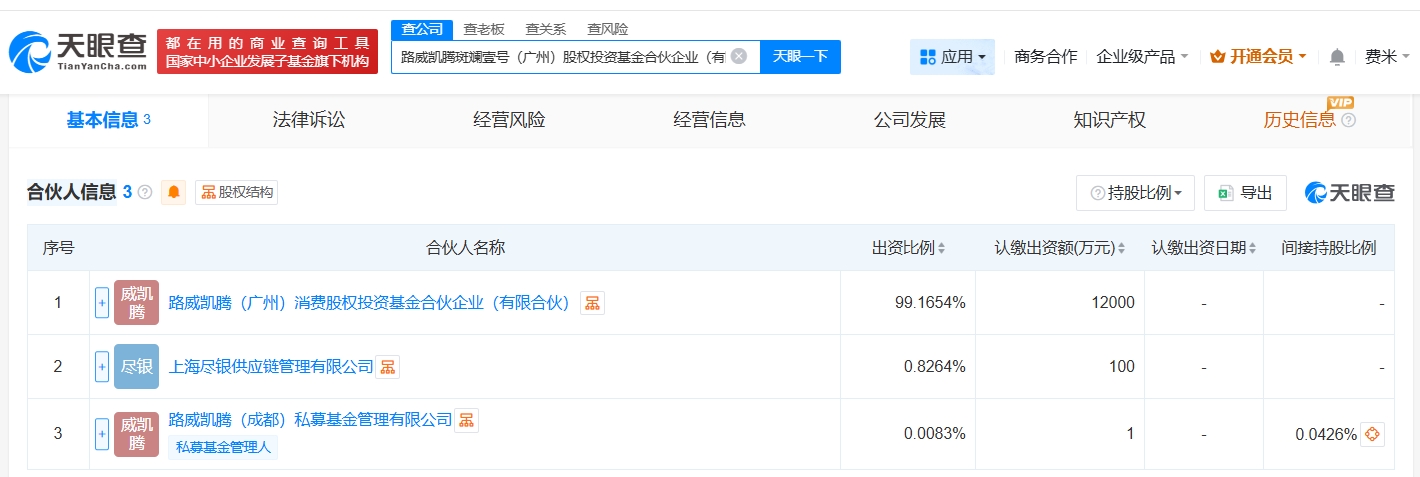 雷达财经讯,天眼查工商信息显示,近日,路威凯腾斑斓壹号(广州)股权投资基金合伙企业(有限合伙)、路威凯腾机遇贰号(广州)股权投资基金合伙企业(有限合伙)成立,执行事务合伙人均为路威凯腾(成都)私募基金管理有限公司,出资额分别为约1.2亿人民币、2001万人民币,经营范围均为以私募基金从事股权投资、投资管理、资产管理等活动。合伙人信息显示,前者由路威凯腾(广州)消费股权投资基金合伙企业(有限合伙)、上海尽银供应链管理有限公司、路威凯腾(成都)私募基金管理有限公司共同出资,后者由路凯(海南)投资合伙企业(有限合伙)、路威凯腾(成都)私募基金管理有限公司共同出资。