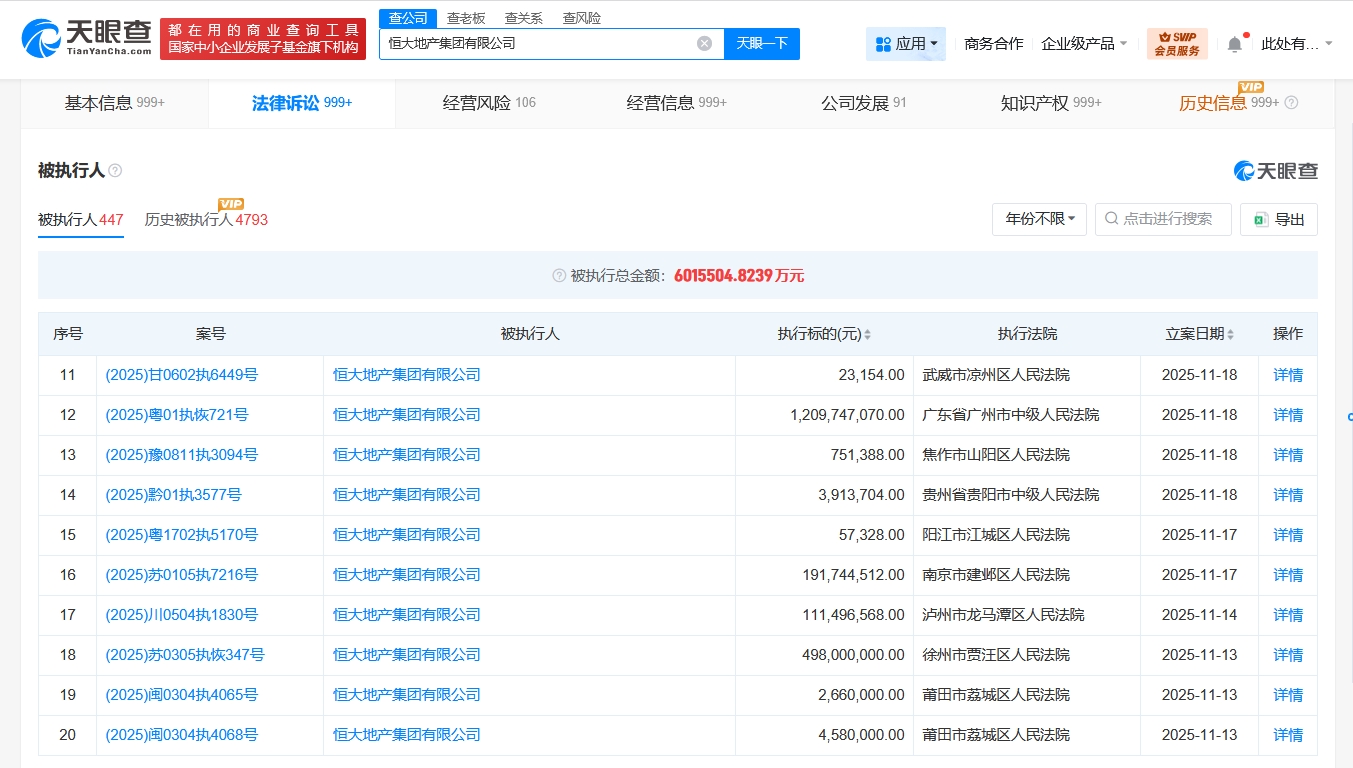 天眼风险信息显示,恒大地产集团有限公司现存440余条被执行人信息,被执行总金额超601亿元,此外,该公司还存在多条限制消费令、失信被执行人(老赖)及终本案件信息。