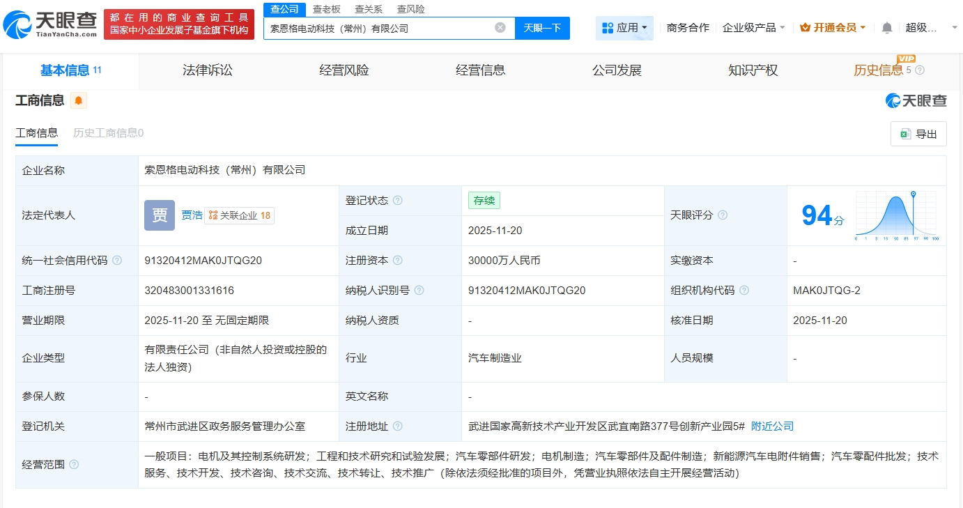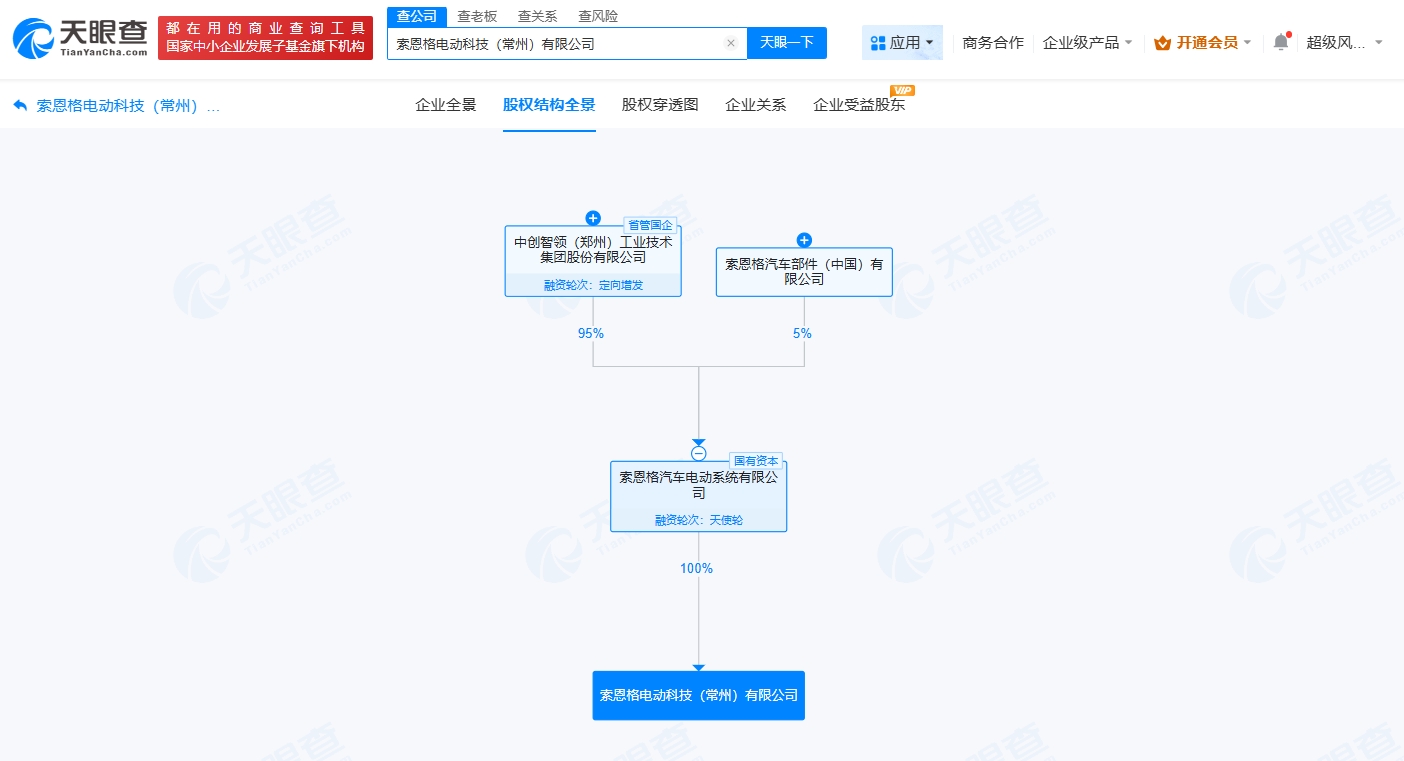 雷达财经讯,天眼查App显示,近日,索恩格电动科技(常州)有限公司成立,法定代表人为贾浩,注册资本3亿人民币,经营范围包括电机及其控制系统研发、工程和技术研究和试验发展、汽车零部件研发、电机制造等。股权全景穿透图显示,该公司由索恩格汽车电动系统有限公司全资持股,后者由中创智领(601717)、索恩格汽车部件(中国)有限公司共同持股。