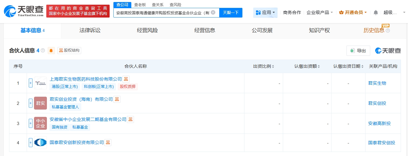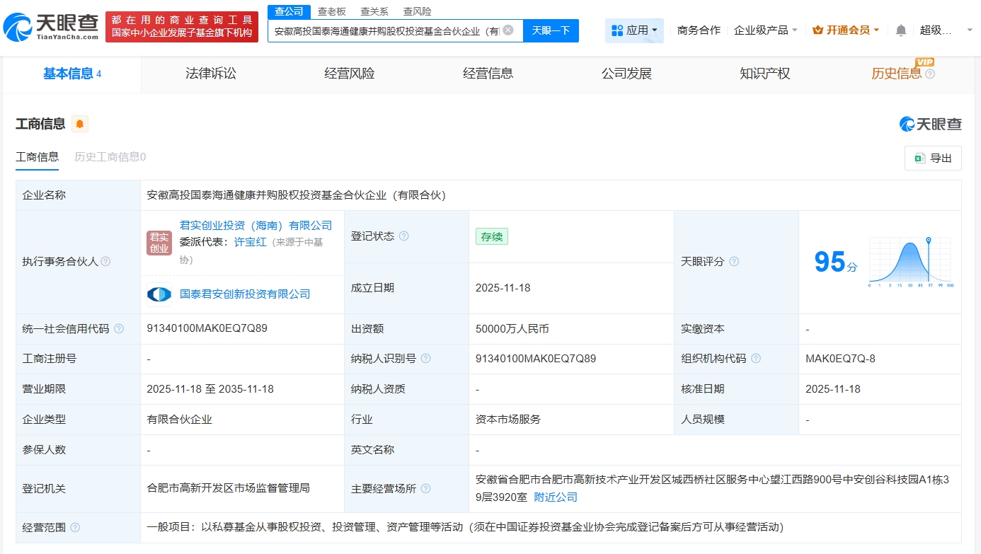 雷达财经讯,天眼查App显示,近日,安徽高投国泰海通健康并购股权投资基金合伙企业(有限合伙)成立,执行事务合伙人为君实创业投资(海南)有限公司、国泰君安创新投资有限公司,出资额5亿人民币,经营范围包括以私募基金从事股权投资、投资管理、资产管理等活动。合伙人信息显示,该基金由君实生物(688180)、安徽省中小企业发展二期基金有限公司、国泰君安创新投资有限公司等共同出资。