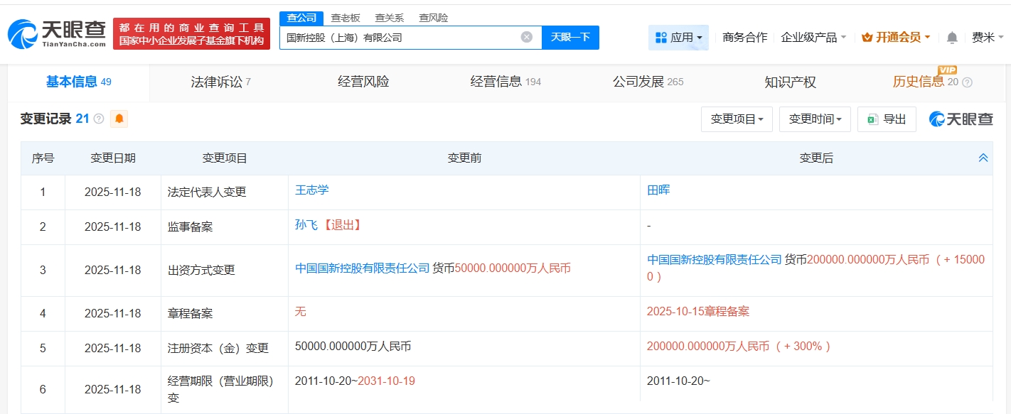 雷达财经讯,天眼查工商信息显示,近日,国新控股(上海)有限公司发生工商变更,王志学卸任法定代表人,由田晖接任,同时,注册资本由5亿人民币增至20亿人民币,增幅300%。