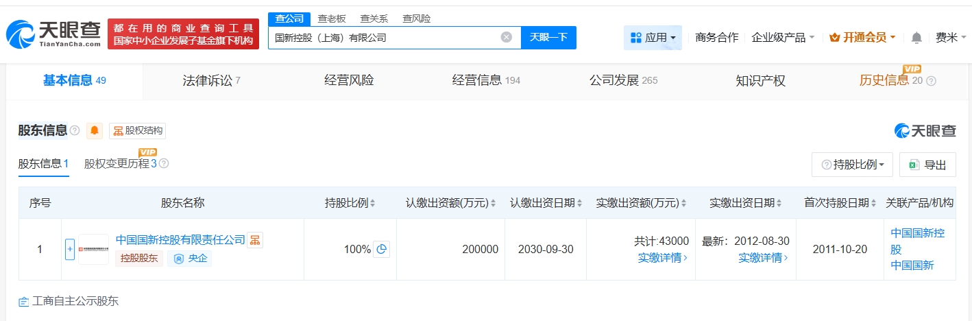国新控股(上海)有限公司成立于2011年10月,经营范围包括通讯信息软件开发及销售、通讯信息设备销售、资产管理、实业投资等。股东信息显示,该公司由中国国新控股有限责任公司全资持股。