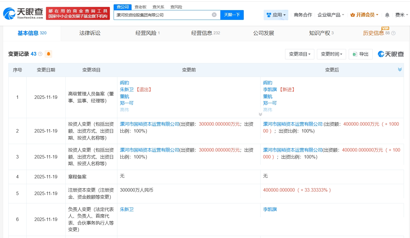 雷达财经讯,天眼查工商信息显示,近日,漯河投资控股集团有限公司发生工商变更,朱新卫卸任法定代表人,由李凯旗接任,同时,注册资本由30亿人民币增至40亿人民币,增幅约33%。