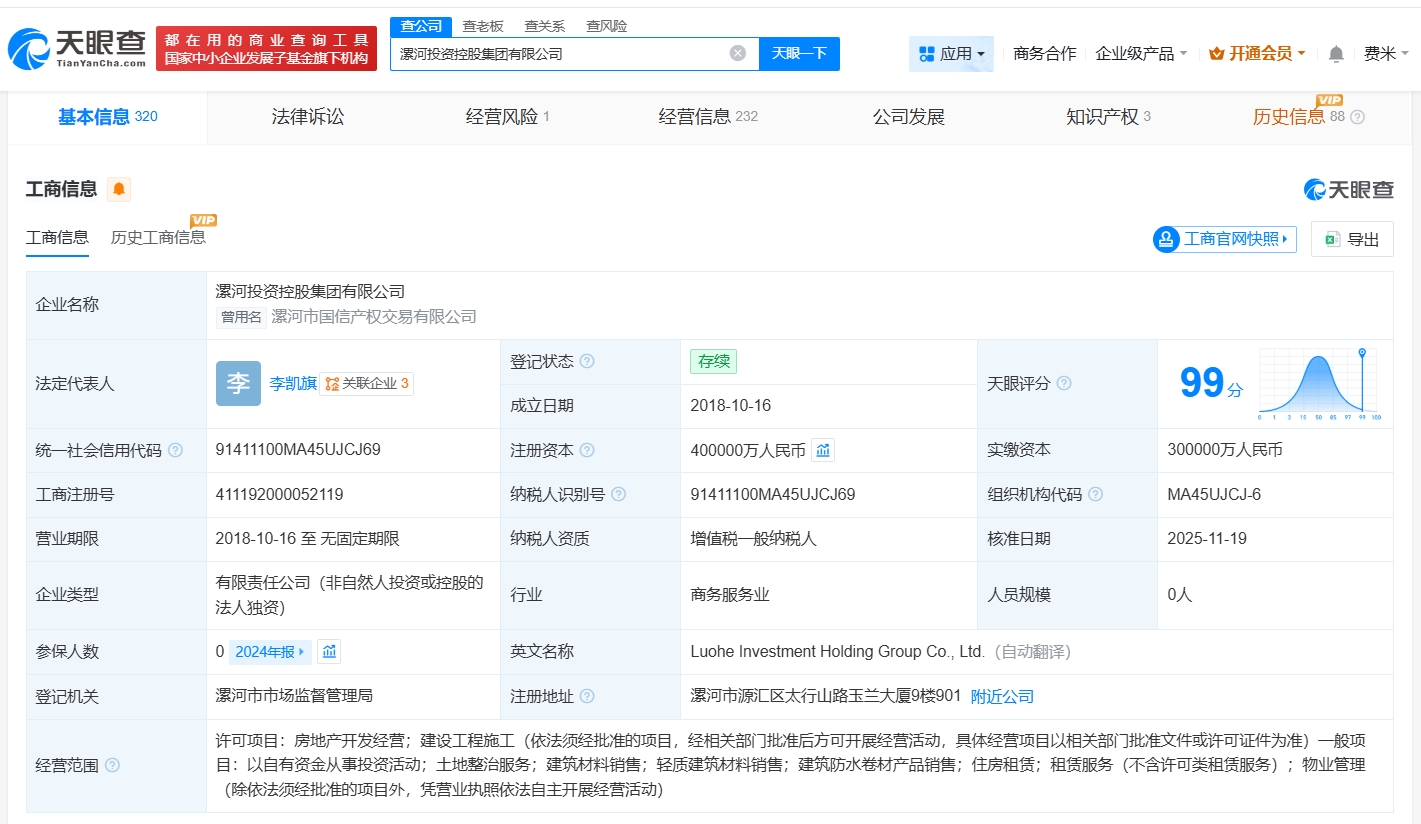 漯河投资控股集团有限公司成立于2018年10月,经营范围包括房地产开发经营、建设工程施工、以自有资金从事投资活动、土地整治服务等。股东信息显示,该公司由漯河市国裕资本运营有限公司全资持股。