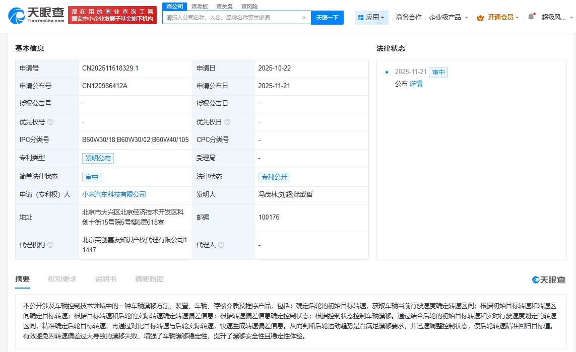 雷达财经讯,天眼查App显示,11月21日,小米汽车科技有限公司申请的“车辆漂移方法、装置、车辆、存储介质及程序产品”专利公布。