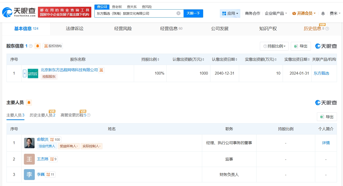 雷达财经讯,天眼查App显示,近日,东方甄选(珠海)旅游文化有限公司发生工商变更,孙东旭卸任法定代表人、执行董事,俞敏洪接任法定代表人并担任经理、执行公司事务的董事。