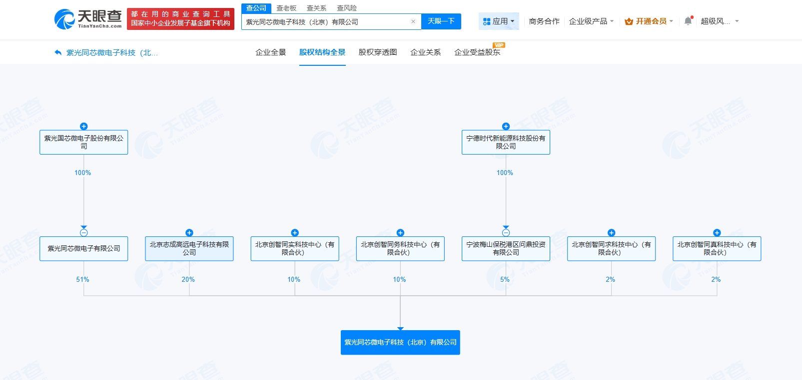 雷达财经讯,天眼查App显示,近日,紫光同芯微电子科技(北京)有限公司成立,法定代表人为陈杰,注册资本3亿人民币,经营范围包括集成电路设计、集成电路芯片设计及服务、软件开发、电子产品销售等。股权全景穿透图显示,该公司由紫光国微旗下紫光同芯微电子有限公司、宁德时代旗下宁波梅山保税港区问鼎投资有限公司等共同持股。