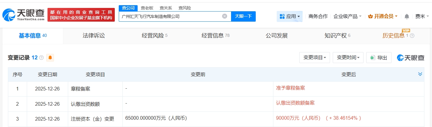 雷达财经讯,天眼查App显示,近日,广州汇天飞行汽车制造有限公司发生工商变更,注册资本由6.5亿人民币增至9亿人民币,增幅约38%。
