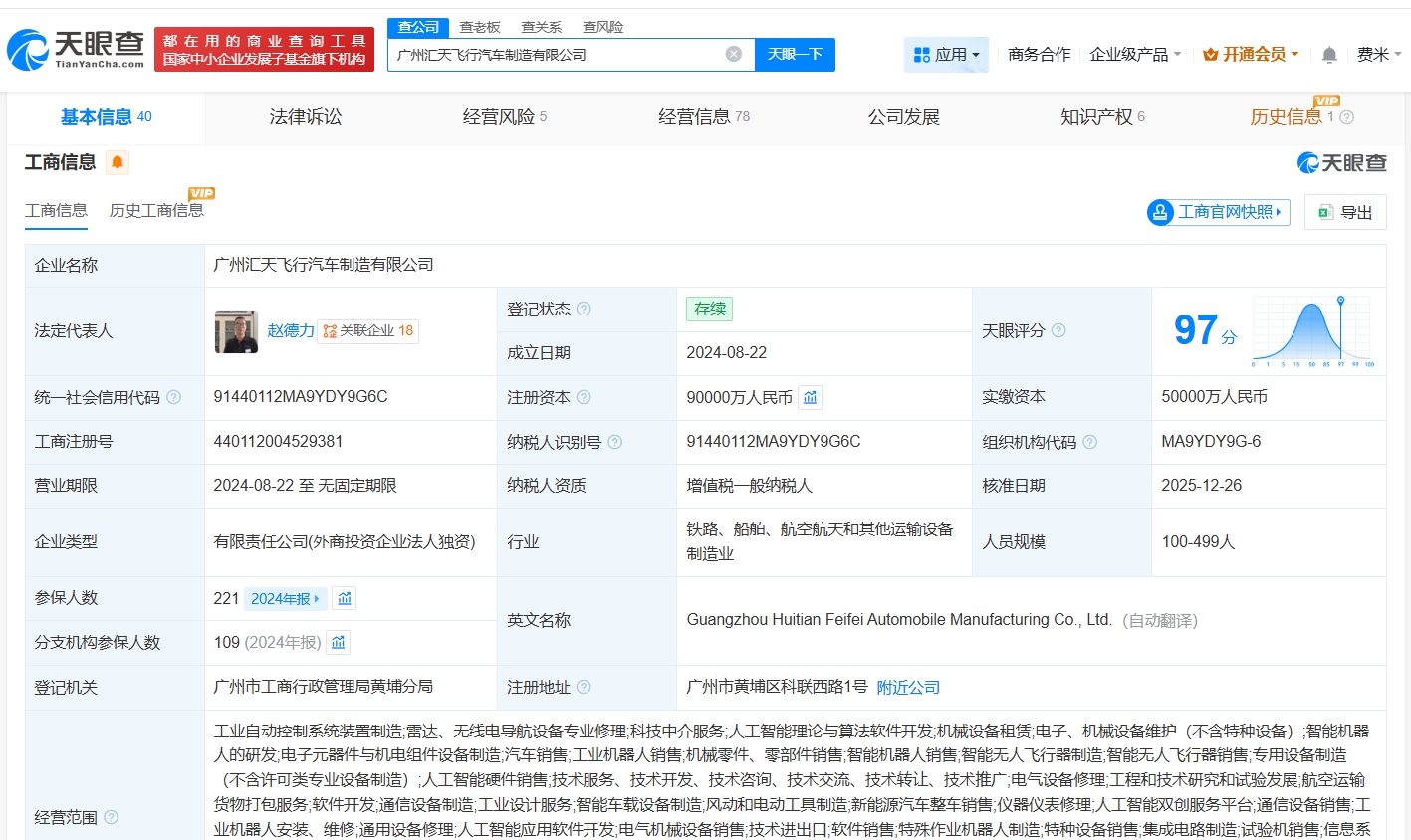 该公司成立于2024年8月,法定代表人为赵德力,经营范围包括工业自动控制系统装置制造、科技中介服务、人工智能理论与算法软件开发等,由广东汇天飞行汽车有限公司全资持股,后者为小鹏汽车旗下HT Flying Car (Hong Kong) Limited全资子公司。