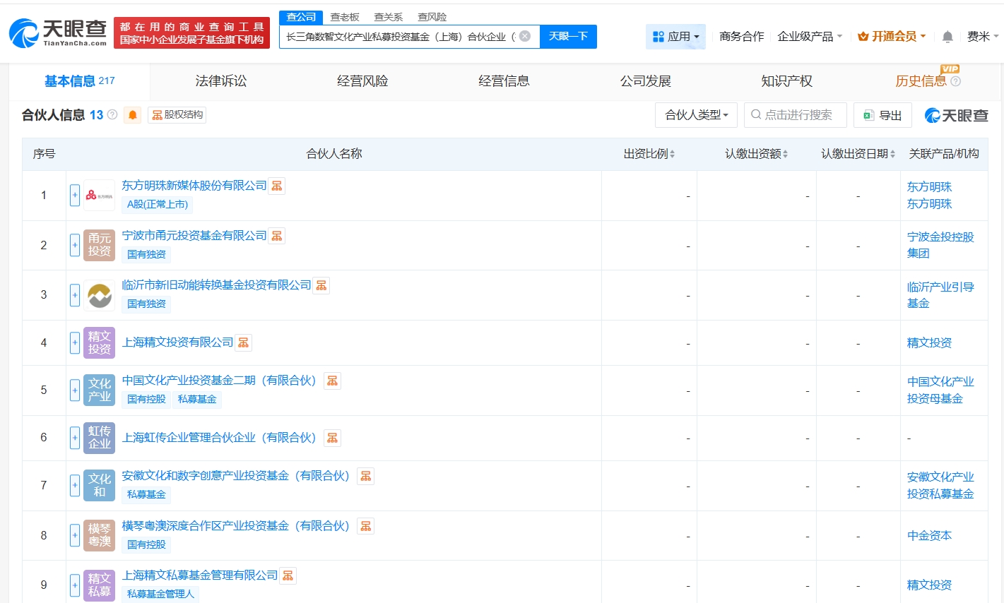雷达财经讯,天眼查App显示,近日,长三角数智文化产业私募投资基金(上海)合伙企业(有限合伙)成立,执行事务合伙人为海通创意私募基金管理有限公司,出资额30.03亿人民币,经营范围为以私募基金从事股权投资、投资管理、资产管理等活动,由东方明珠(600637)、宁波市甬元投资基金有限公司、上海精文投资有限公司等共同出资。
