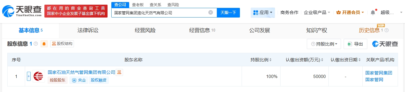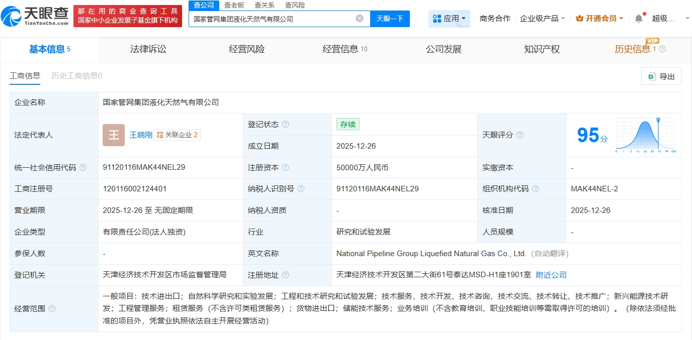 雷达财经讯,天眼查App显示,近日,国家管网集团液化天然气有限公司成立,法定代表人为王晓刚,注册资本5亿人民币,经营范围包括技术进出口、自然科学研究和实验发展、工程和技术研究和试验发展等。股东信息显示,该公司由国家石油天然气管网集团有限公司全资持股。