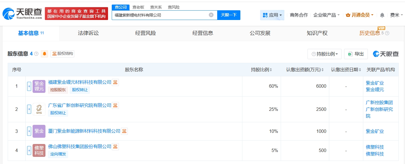 雷达财经讯,天眼查App显示,近日,福建紫新锂电材料有限公司成立,法定代表人为罗忠岩,注册资本1亿人民币,经营范围包括电子专用材料制造、电子专用材料研发、电子专用材料销售等,由紫金矿业(601899)旗下福建紫金锂元材料科技有限公司、厦门紫金新能源新材料科技有限公司、广东省广新创新研究院有限公司、佛塑科技(000973)共同持股。