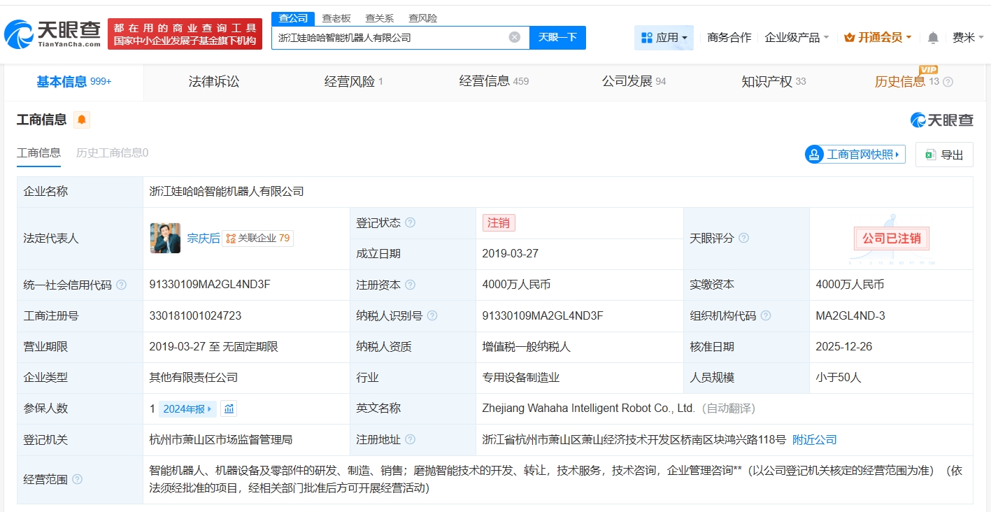 雷达财经讯,天眼查工商信息显示,近日,浙江娃哈哈智能机器人有限公司登记状态由存续变更为注销。