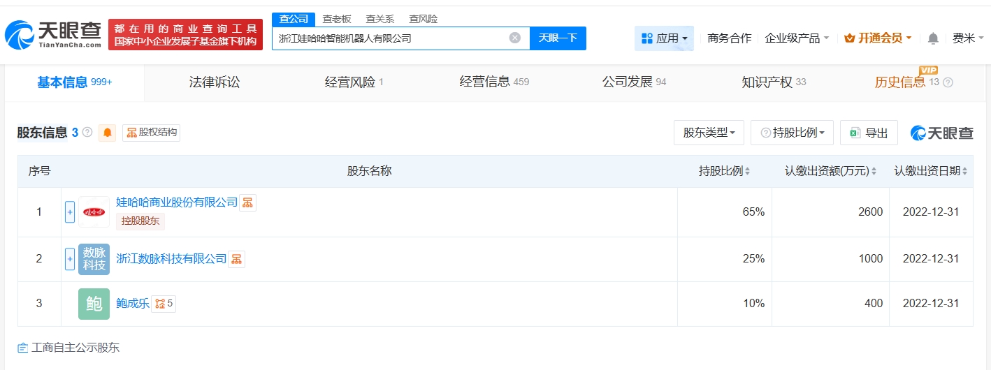 浙江娃哈哈智能机器人有限公司成立于2019年3月,法定代表人为宗庆后,注册资本4000万人民币,经营范围包括智能机器人、机器设备及零部件的研发、制造、销售等。股东信息显示,该公司由娃哈哈商业股份有限公司、浙江数脉科技有限公司、鲍成乐共同持股。