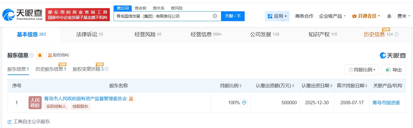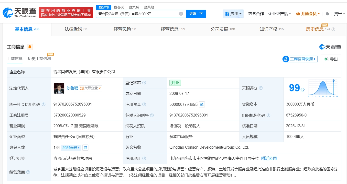 青岛国信发展(集团)有限责任公司成立于2008年7月,法定代表人为刘鲁强,经营范围包括城乡重大基础设施项目投资建设与运营、政府重大公益项目的投资建设与运营等。股东信息显示,该公司由青岛市人民政府国有资产监督管理委员会全资持股。