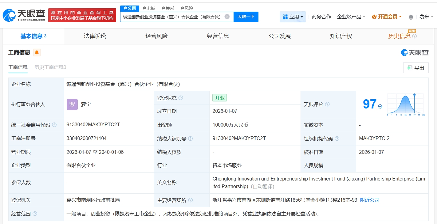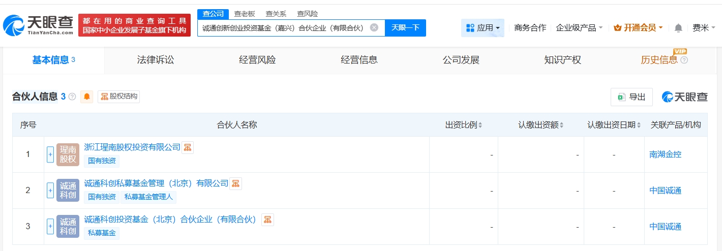 雷达财经讯,天眼查工商信息显示,近日,诚通创新创业投资基金(嘉兴)合伙企业(有限合伙)成立,执行事务合伙人为罗宁,出资额10亿人民币,经营范围为创业投资、股权投资。合伙人信息显示,该基金由浙江瑆南股权投资有限公司、诚通科创私募基金管理(北京)有限公司、诚通科创投资基金(北京)合伙企业(有限合伙)共同出资。