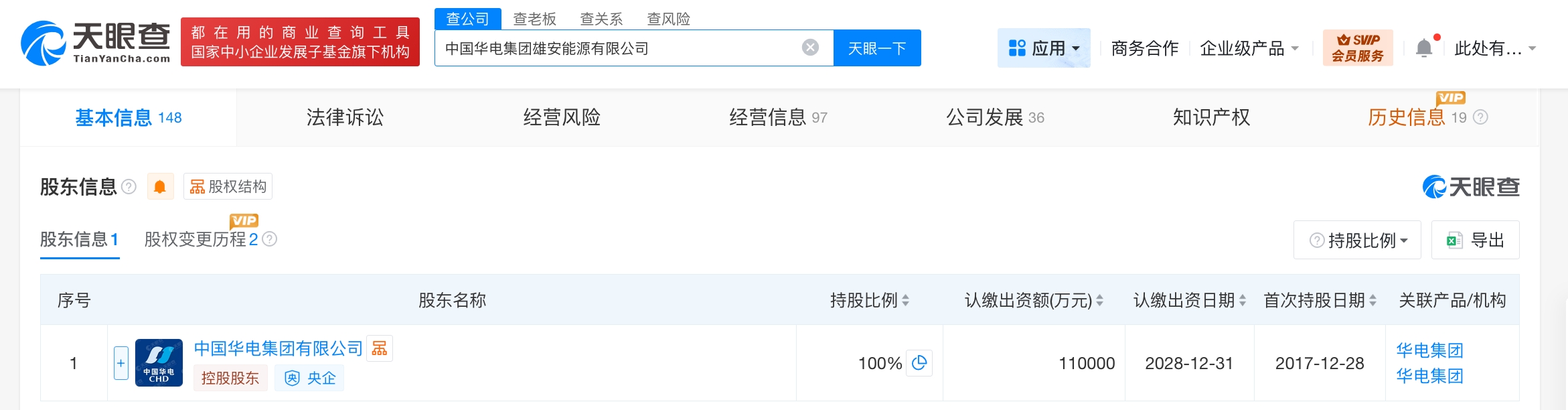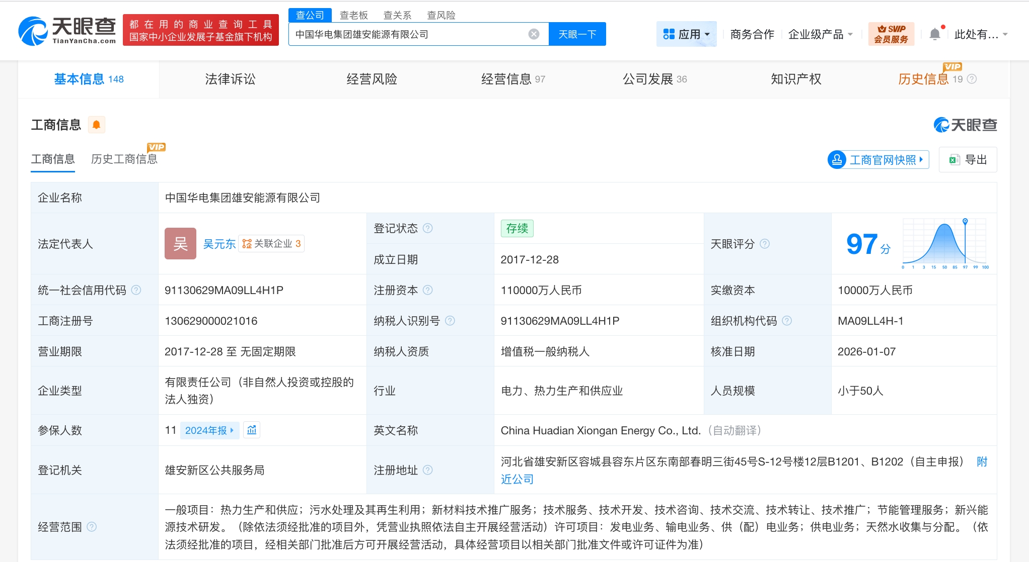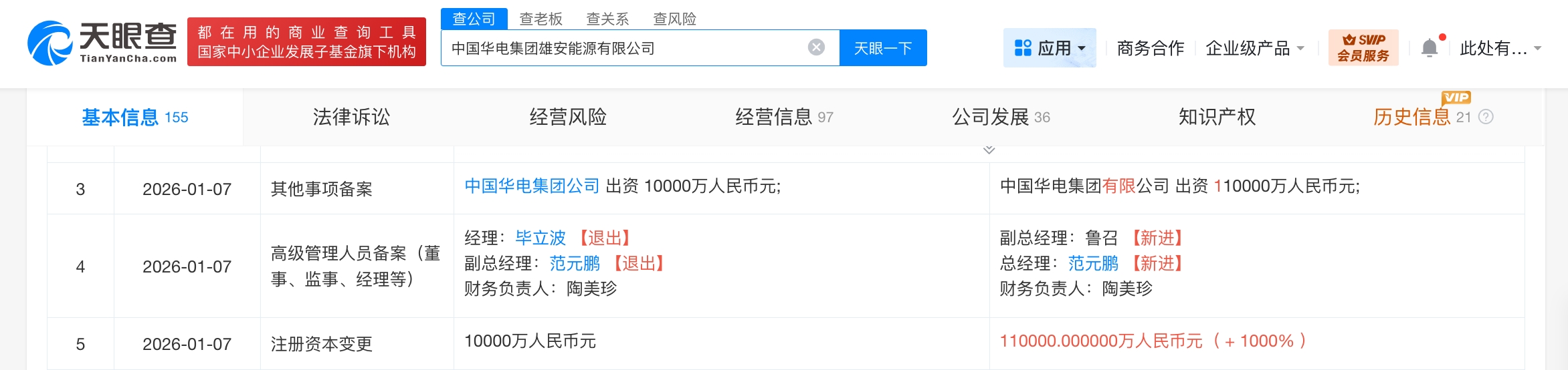 雷达财经讯,天眼查工商信息显示,近日,中国华电集团雄安能源有限公司发生工商变更,注册资本由1亿人民币增至11亿人民币,增幅1000%。