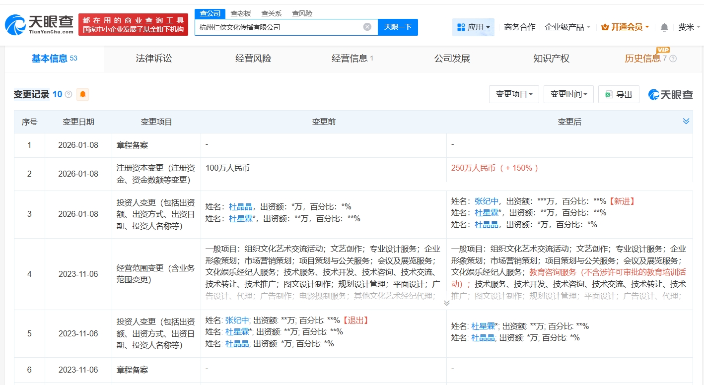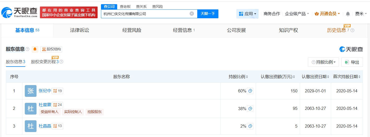 杭州仁侠文化传播有限公司成立于2020年5月,法定代表人为张纪中妻子杜星霖,经营范围包括组织文化艺术交流活动、文艺创作、专业设计服务、企业形象策划等。股东信息显示,该公司由杜星霖、杜晶晶、张纪中共同持股。