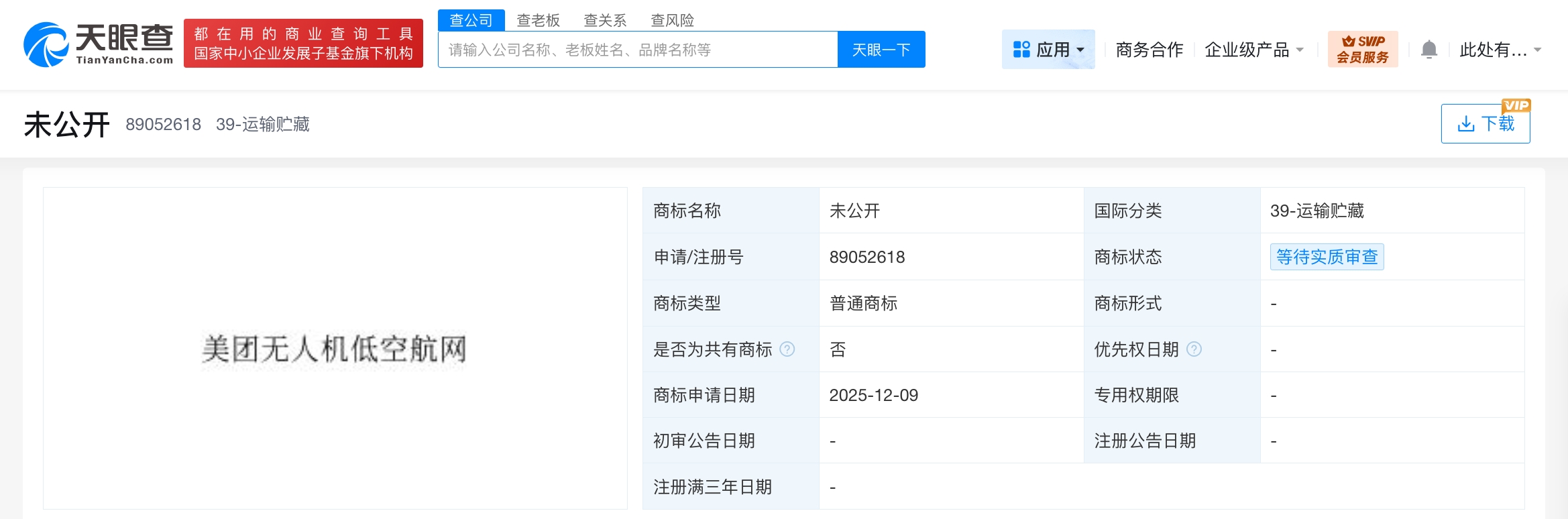 雷达财经讯,天眼查知识产权信息显示,近日,美团关联公司北京三快科技有限公司申请注册多枚“美团智能接驳机场”“美团无人机玄武云”“美团无人机云枢”“美团无人机低空航网”等商标,国际分类包括运输工具、运输贮藏等,当前商标状态均为等待实质审查。