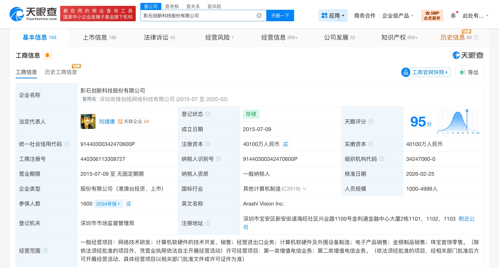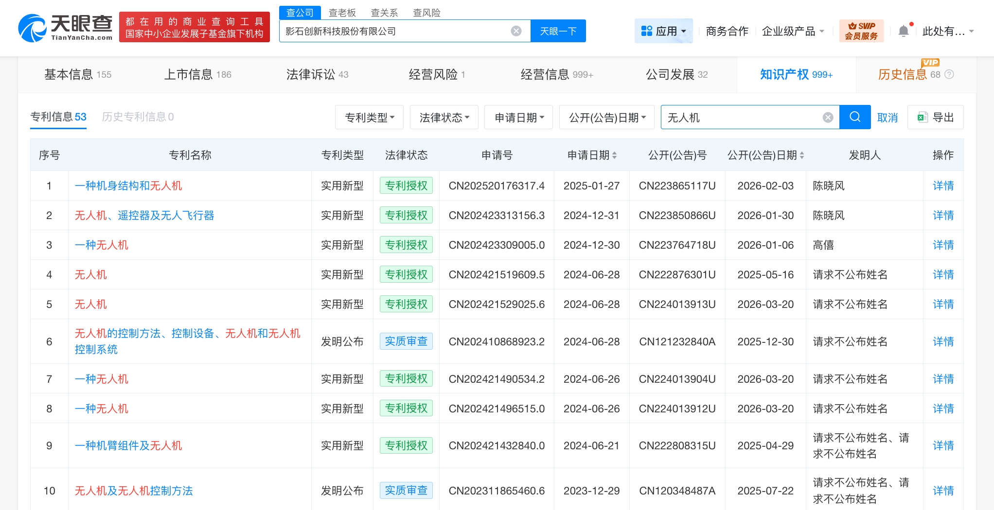 天眼查App显示,影石创新关联公司影石创新科技股份有限公司成立于2015年7月,法定代表人为刘靖康,注册资本4.01亿人民币,经营范围含网络技术研发,计算机软硬件的技术开发、销售,经营进出口业务,计算机软硬件及外围设备制造,电子产品销售,金银制品销售等。股东信息显示,该公司由北京岚锋创视网络科技有限公司、迅雷網絡技術有限公司、厦门富凯创业投资合伙企业(有限合伙)等共同持股。知识产权信息显示,该公司多项无人机相关专利已获授权,包括“无人机、遥控器及无人飞行器”“一种机身结构和无人机”等,其中,部分专利发明人被记载为“请求不公布姓名”。