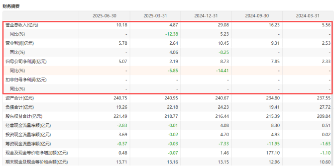 而截至2025年6月末,其营业总收入为10.18亿元,归母净利润5.07亿元,尽管上半年数据未披露同比变化,但结合一季度的下滑趋势,全年业绩增长的压力已然显现。