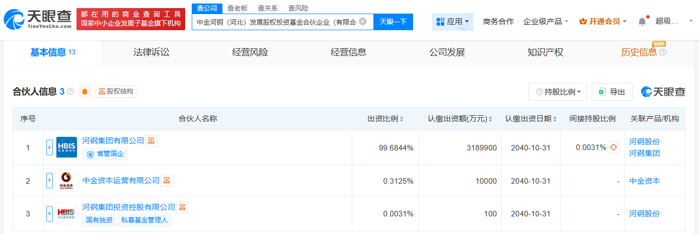 雷达财经讯,天眼查App显示,近日,中金河钢(河北)发展股权投资基金合伙企业(有限合伙)成立,执行事务合伙人为中金资本运营有限公司,出资额320亿人民币,经营范围包括创业投资,以私募基金从事股权投资、投资管理、资产管理等活动。合伙人信息显示,该基金由河钢集团有限公司、河钢集团投资控股有限公司、中金资本运营有限公司共同出资。
