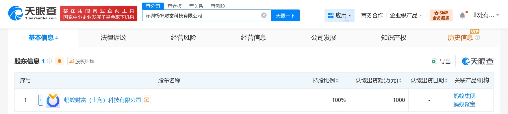 蚂蚁集团在深圳成立蚂蚁财富科技公司 注册资本1000万
