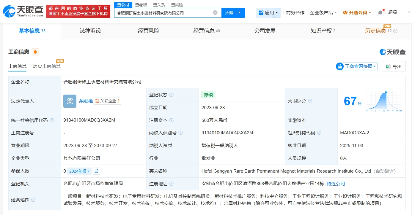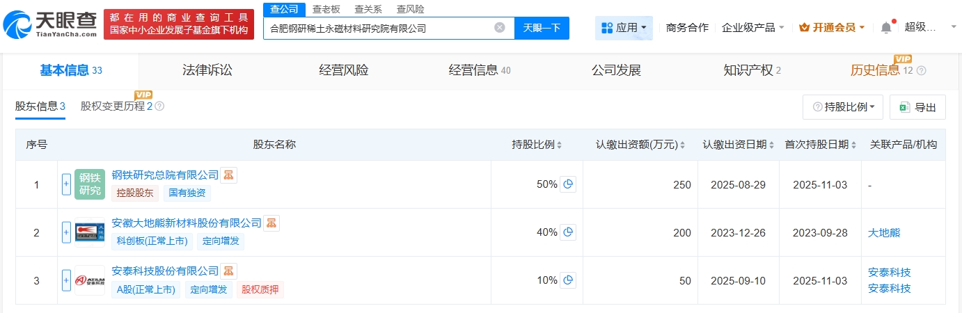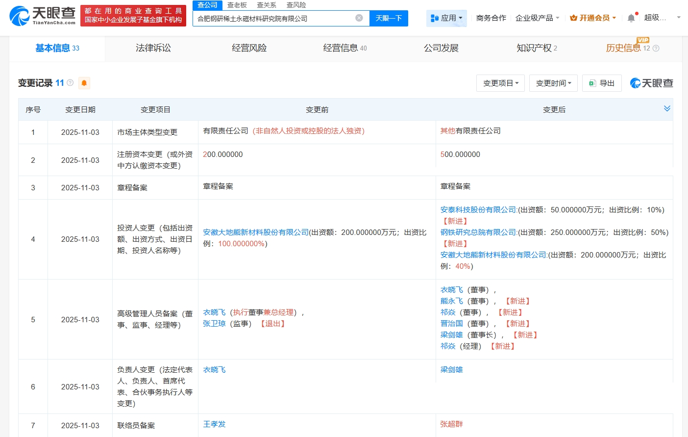 雷达财经讯,天眼查工商信息显示,近日,合肥钢研稀土永磁材料研究院有限公司发生工商变更,新增安泰科技(000969)、钢铁研究总院有限公司为股东,注册资本由200万人民币增至500万人民币,同时法定代表人及高管均发生变更。