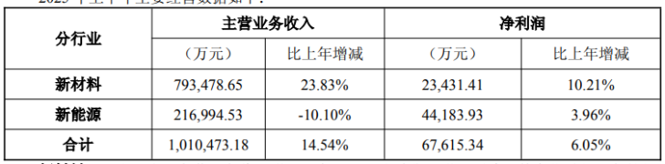 值得注意的是,其单吨净利润为1865.48元/吨,2024年同期为1879.25元/吨。在业务规模扩张的背景下,新材料业务净利润增速低于收入增速,单位盈利能力未同步提升,反映出公司难以在原材料价格波动与市场竞争加剧的双重挤压下守住盈利空间。