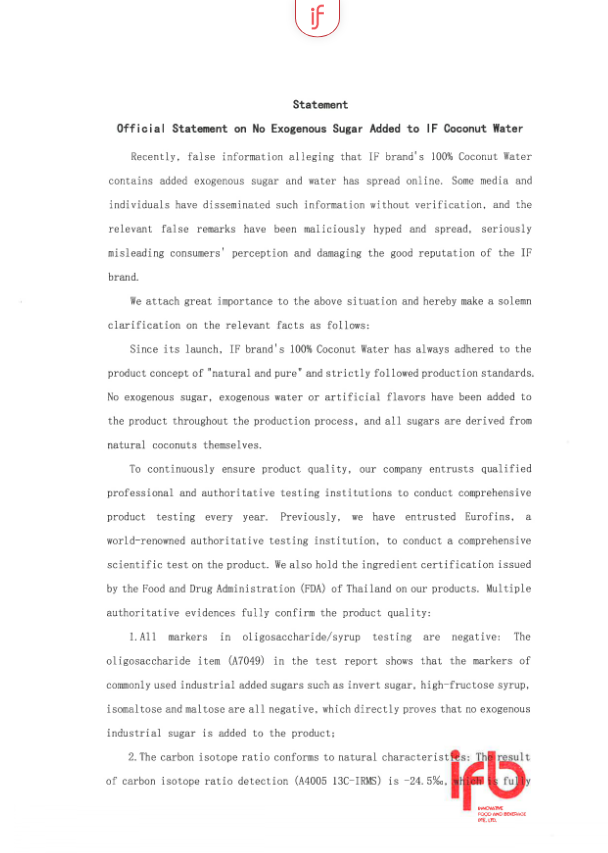 事件发酵后,IF椰子水在港交所发布澄清公告,称媒体相关指称虚假且具有误导性。
