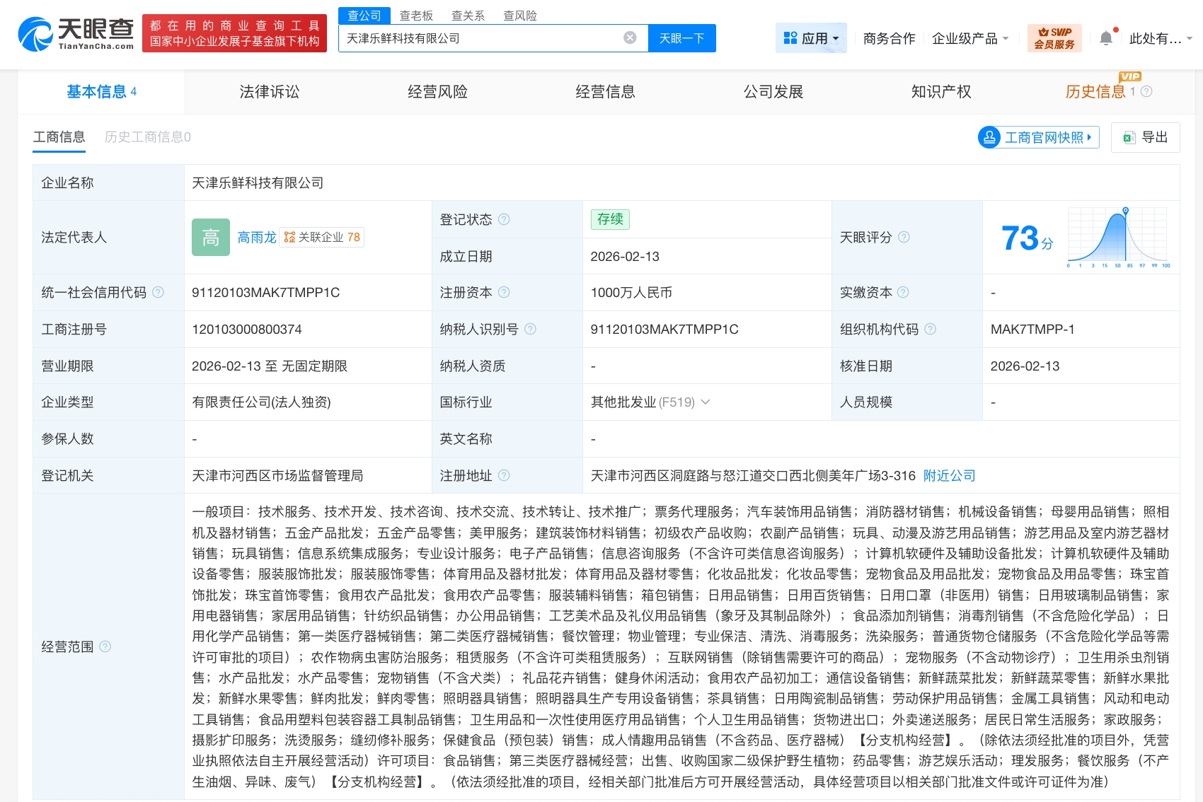 雷达财经讯,天眼查App显示,近日,天津乐鲜科技有限公司成立,法定代表人为高雨龙,注册资本1000万人民币,经营范围含票务代理服务、汽车装饰用品销售、消防器材销售、机械设备销售、母婴用品销售、初级农产品收购、农副产品销售、信息系统集成服务、专业设计服务等。股权全景穿透图显示,该公司由深圳乐鲜科技有限公司全资持股,后者为美团旗下Xigua Limited全资子公司。