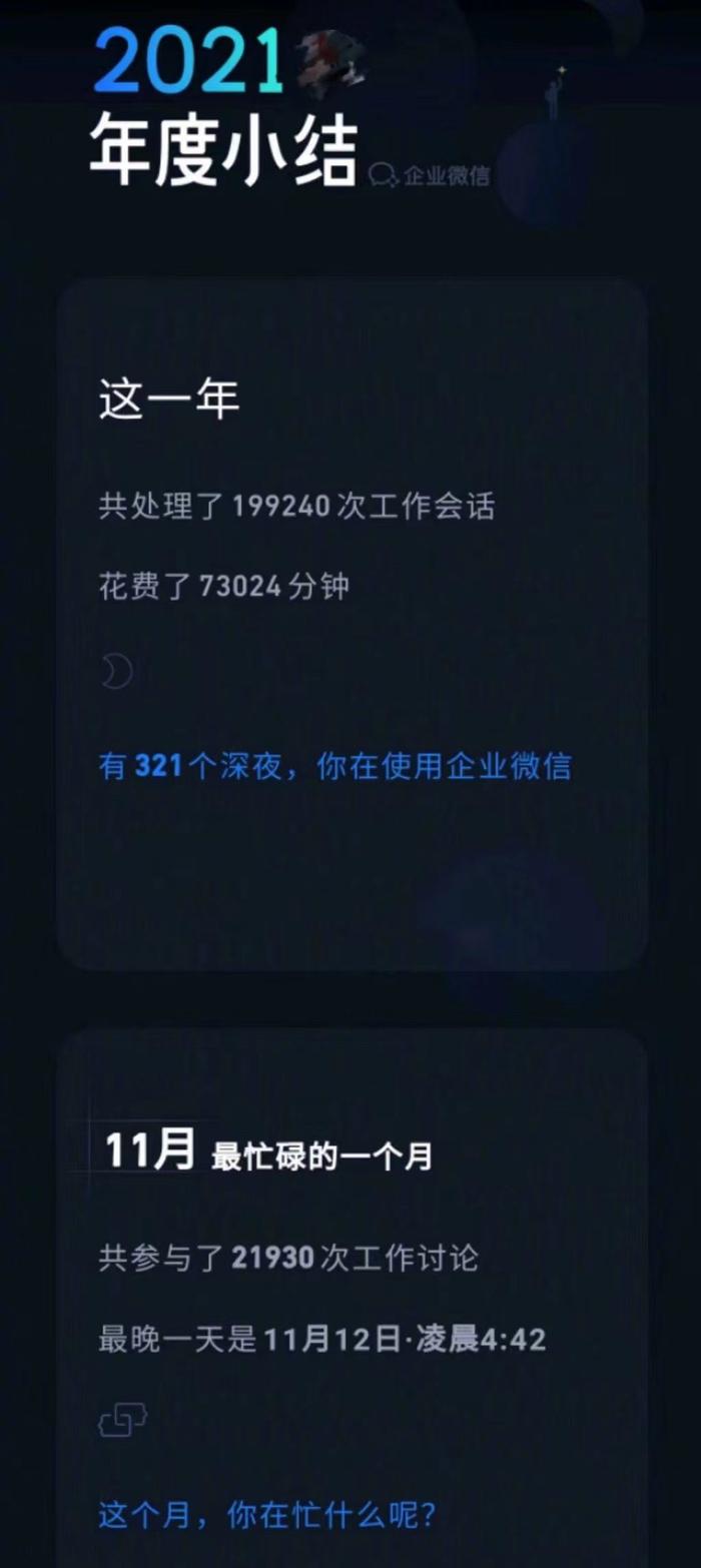 据上述微博用户分享的逝者在2021年12月31日发布的年度小结,图片显示,该员工在过去一年的321个深夜都在使用企业微信,最晚一天工作到凌晨4:42。