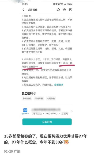 对于前述招聘岗位的年龄限制,该网友吐槽道:“35岁都是包容的了,现在招聘能力优秀才要97年的,97年什么概念,今年不到30岁。”