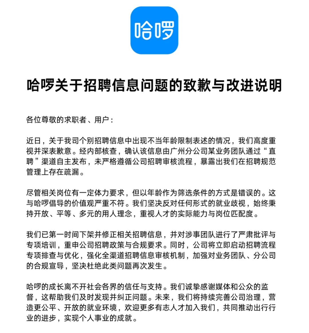 对于个别招聘信息中出现不当年龄限制表述,哈啰深表歉意,并明确表示以年龄作为筛选条件的方式是错误的。