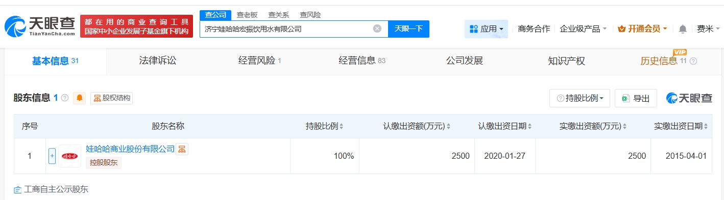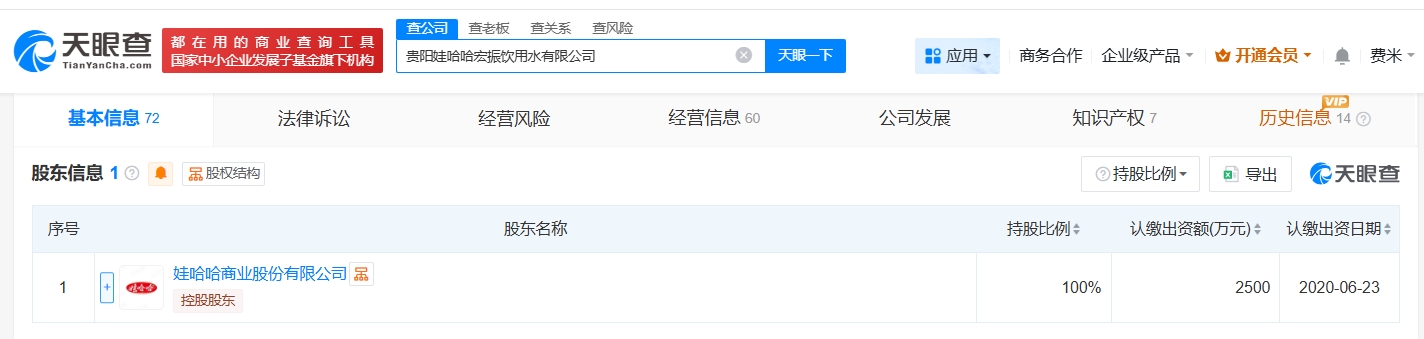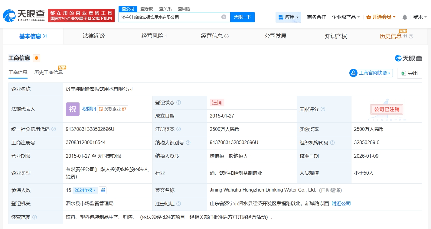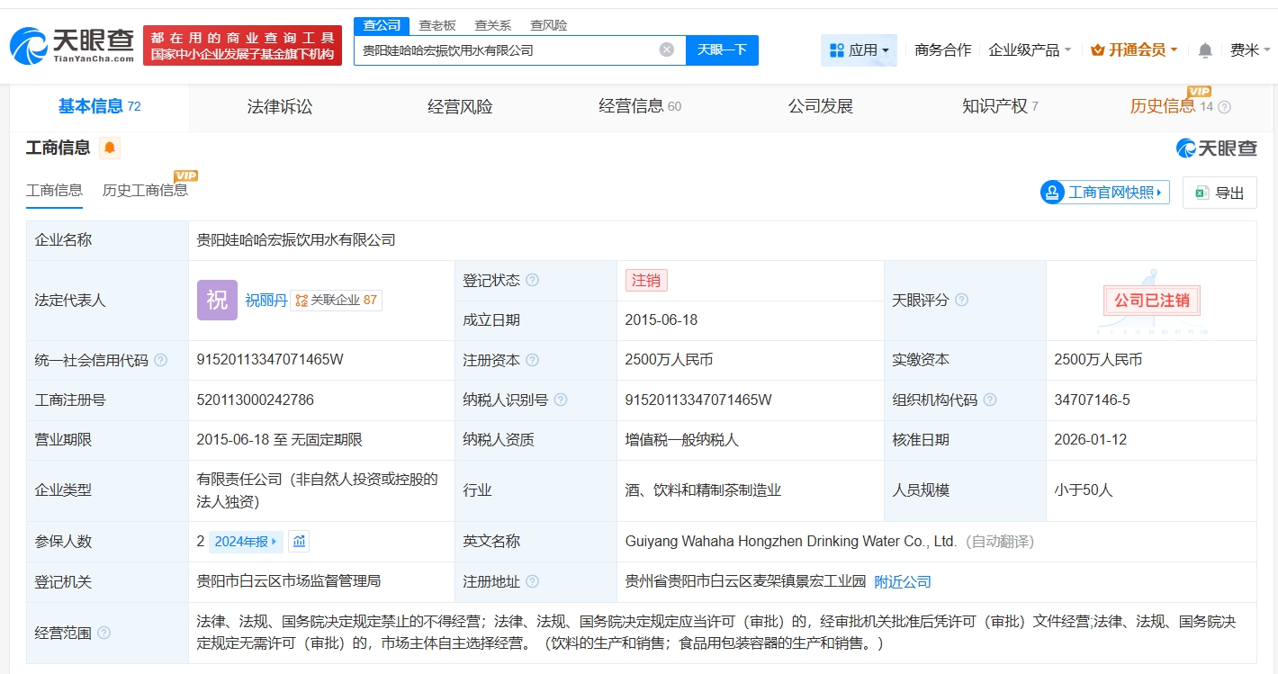 雷达财经讯,天眼查工商信息显示,近日,贵阳娃哈哈宏振饮用水有限公司登记状态由存续变更为注销。 贵阳娃哈哈宏振饮用水有限公司成立于2015年6月,法定代表人为祝丽丹,注册资本2500万人民币,董事为宗馥莉,经营范围为饮料的生产和销售、食品用包装容器的生产和销售。股东信息显示,该公司由娃哈哈商业股份有限公司全资持股。值得一提的是,此前,济宁娃哈哈宏振饮用水有限公司已注销。