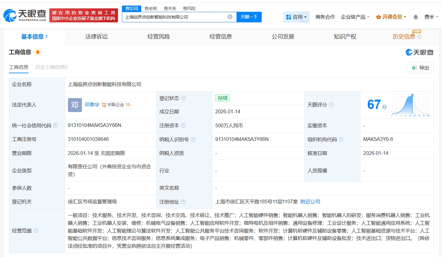 雷达财经讯,天眼查工商信息显示,近日,上海临界点创新智能科技有限公司成立,法定代表人为邓泰华,注册资本500万人民币,经营范围包括人工智能硬件销售、智能机器人销售、智能机器人的研发等。股东信息显示,该公司由智元机器人关联公司智元创新(上海)科技股份有限公司、上海智翎新创科技合伙企业(有限合伙)共同持股。