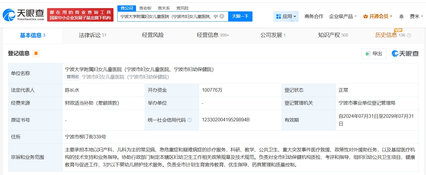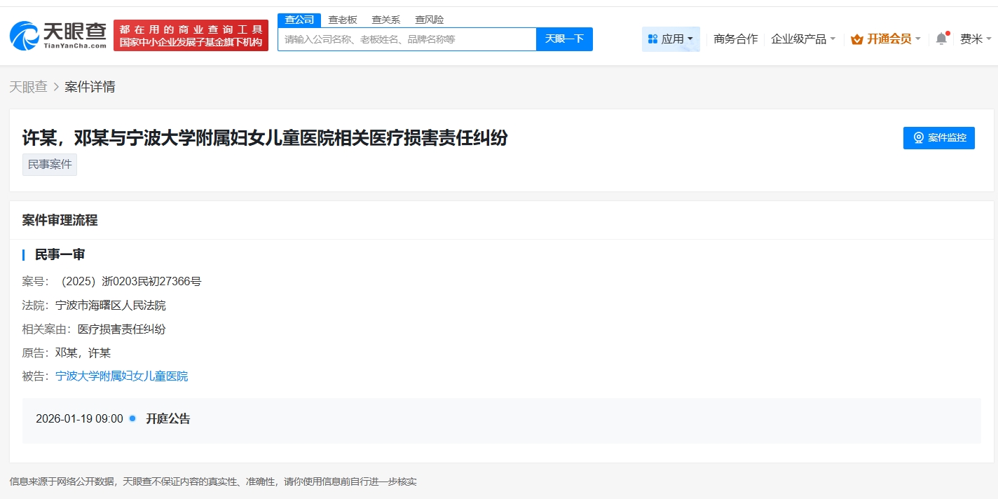 雷达财经讯,天眼查天眼风险信息显示,近日,宁波大学附属妇女儿童医院(宁波市妇女儿童医院、宁波市妇幼保健院)新增一则开庭公告,原告为小洛熙父母许某、邓某,涉及医疗损害责任纠纷案件,该案将于1月19日在宁波市海曙区人民法院开庭审理。 据媒体报道,此前,11月14日,女婴“小洛熙”在宁波大学附属妇女儿童医院接受心脏手术后不幸离世,引发社会关注。对此,宁波卫健委发布通报称,多人被处理。同时,宁波市已启动医疗事故技术鉴定程序,针对家属与医院的医疗损害责任纠纷诉讼,宁波市海曙区人民法院已经依法受理。
