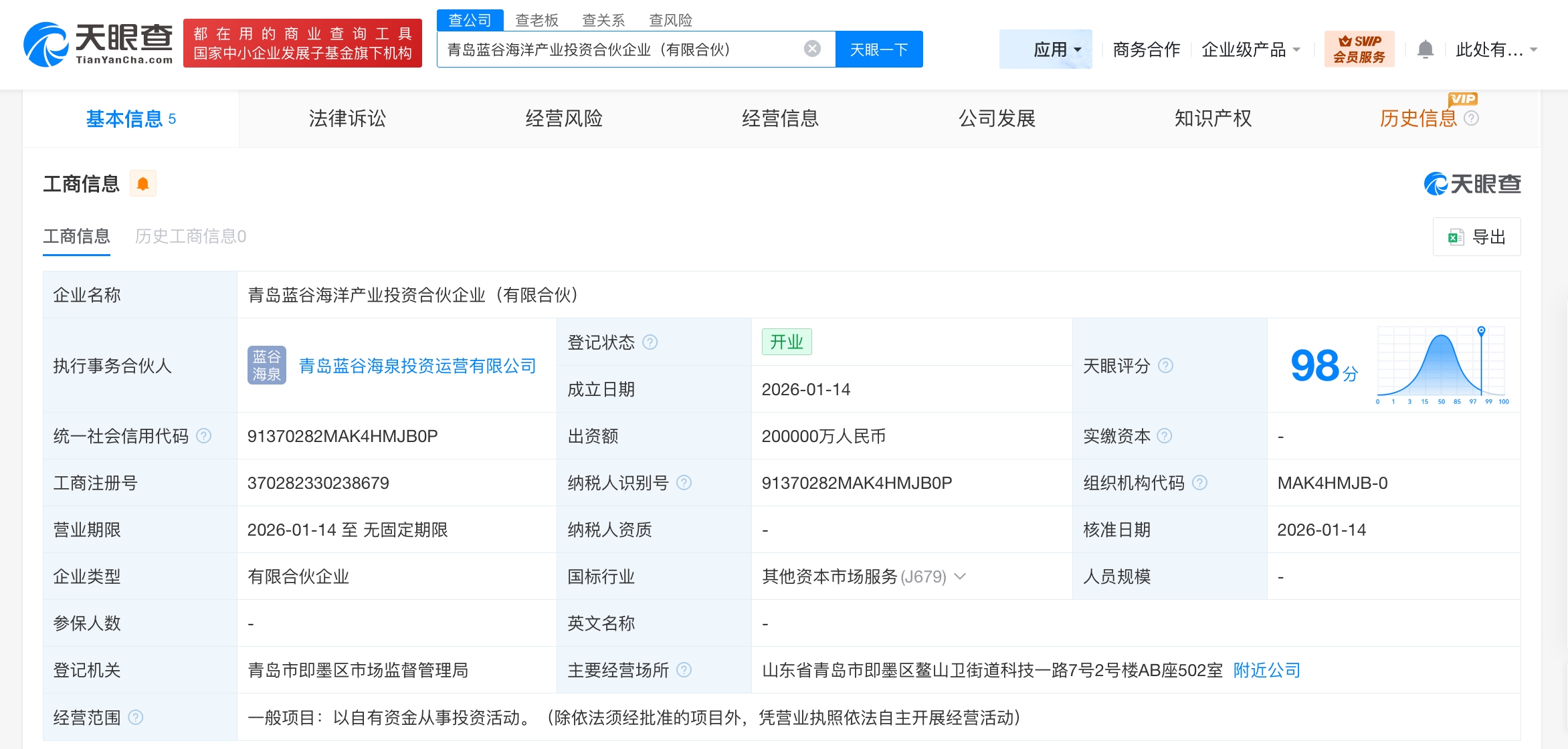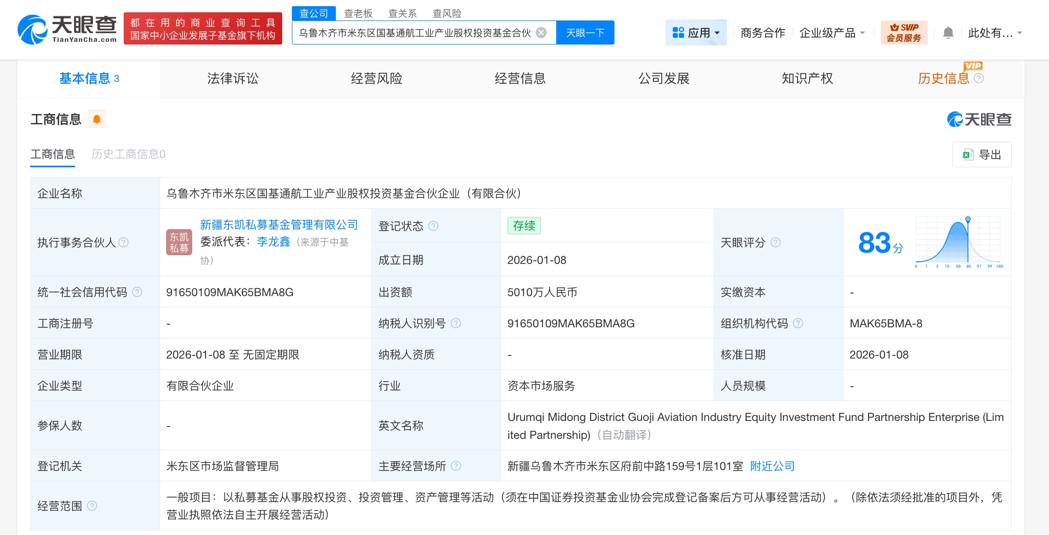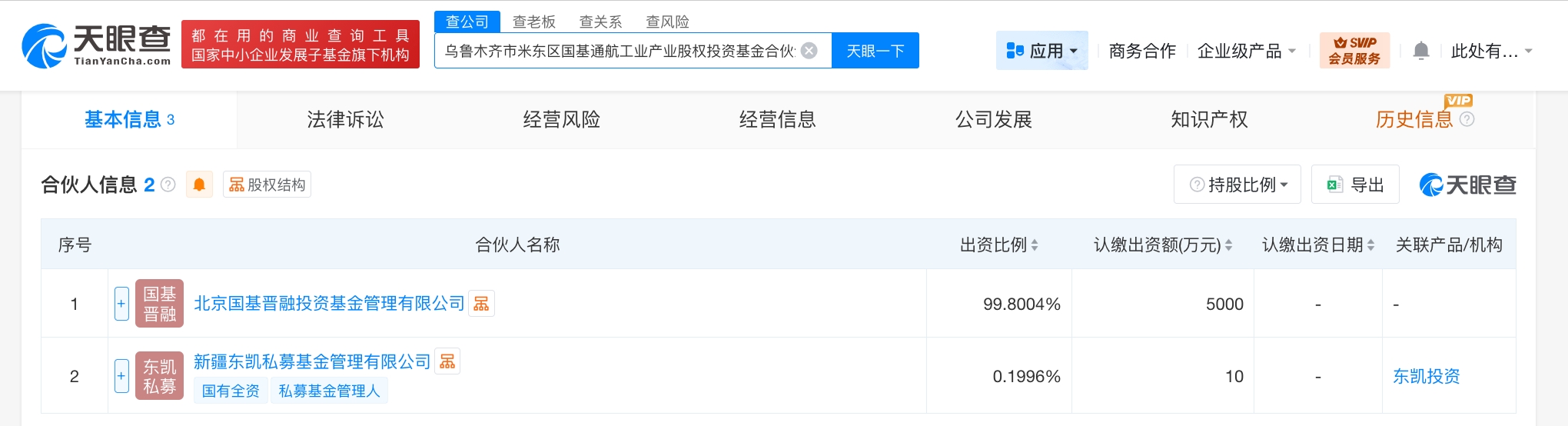 雷达财经讯,天眼查工商信息显示,近日,乌鲁木齐市米东区国基通航工业产业股权投资基金合伙企业(有限合伙)成立,执行事务合伙人为新疆东凯私募基金管理有限公司,出资额5010万人民币,经营范围为以私募基金从事股权投资、投资管理、资产管理等活动。合伙人信息显示,该基金由北京国基晋融投资基金管理有限公司、新疆东凯私募基金管理有限公司共同出资。