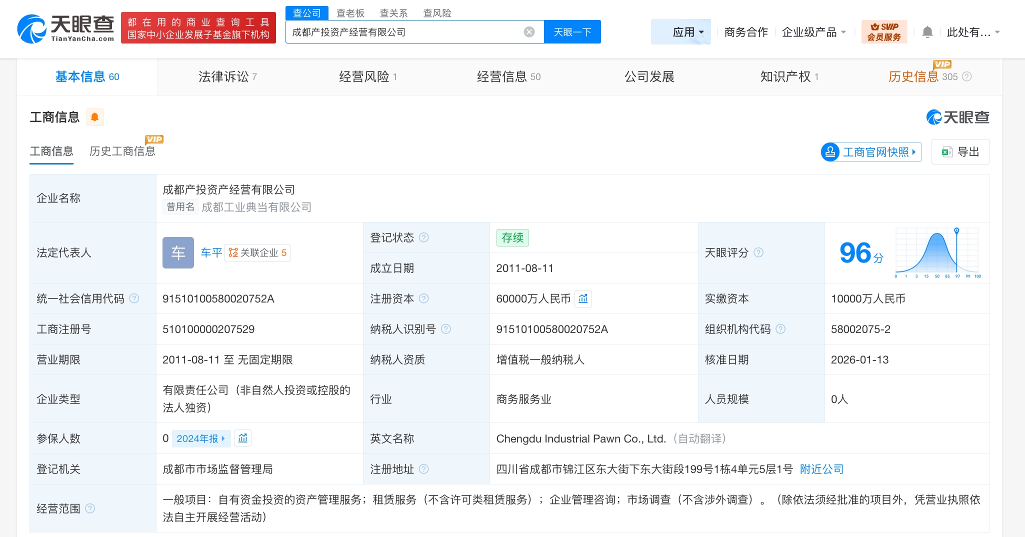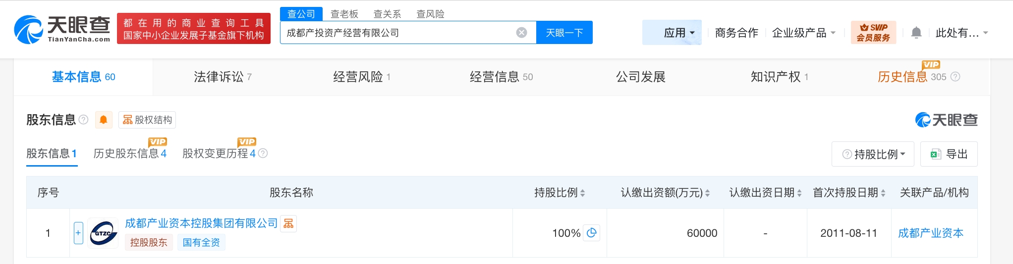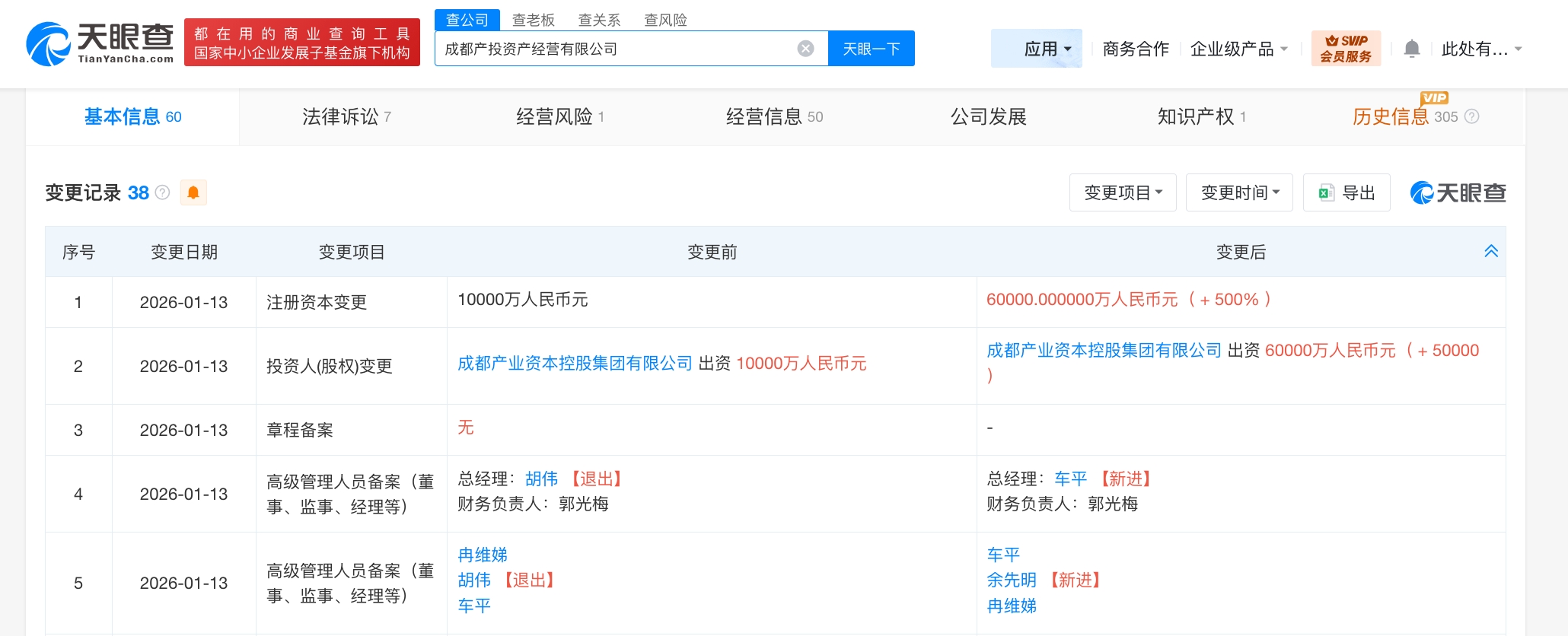 雷达财经讯,天眼查工商信息显示,近日,成都产投资产经营有限公司发生工商变更,注册资本由1亿人民币增至6亿人民币,增幅500%,同时,多位高管发生变更。 该公司成立于2011年8月,法定代表人为车平,经营范围为自有资金投资的资产管理服务、租赁服务、企业管理咨询、市场调查。股东信息显示,该公司由成都产业资本控股集团有限公司全资持股。