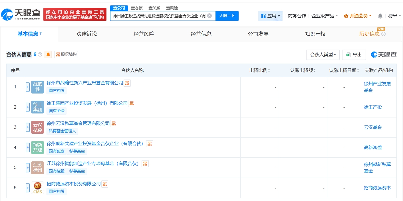 雷达财经讯,天眼查工商信息显示,近日,徐州徐工致远战新先进智造股权投资基金合伙企业(有限合伙)成立,执行事务合伙人为招商致远资本投资有限公司,出资额10亿人民币,经营范围为以私募基金从事股权投资、投资管理、资产管理等活动。合伙人信息显示,该基金由徐州市战略性新兴产业母基金有限公司、徐工集团产业投资发展(徐州)有限公司、招商证券(600999)旗下招商致远资本投资有限公司等共同出资。