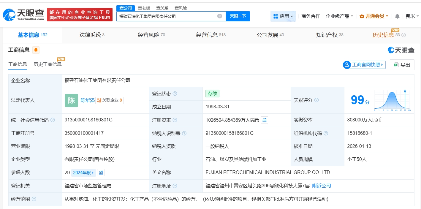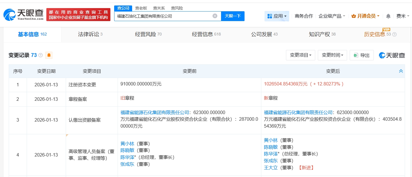 雷达财经讯,天眼查工商信息显示,近日,福建石油化工集团有限责任公司发生工商变更,注册资本由91亿人民币增至约102.65亿人民币,增幅约13%,同时部分主要人员发生变更。 福建石油化工集团有限责任公司成立于1998年3月,法定代表人为陈华泽,经营范围为从事对炼油、化工的投资开发,化工产品的经营。股东信息显示,该公司由福建省能源石化集团有限责任公司、福建省能化石化产业股权投资合伙企业(有限合伙)共同持股。