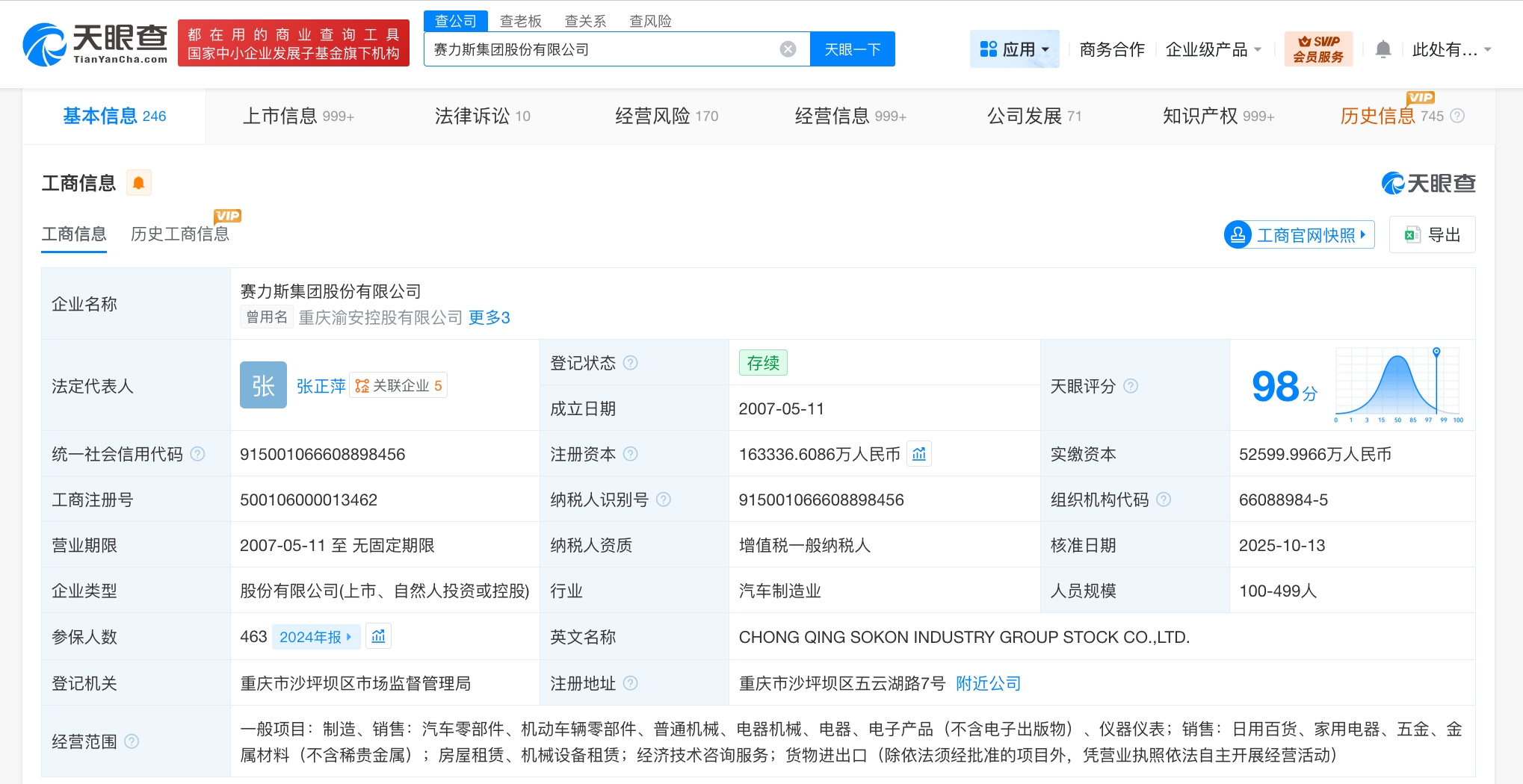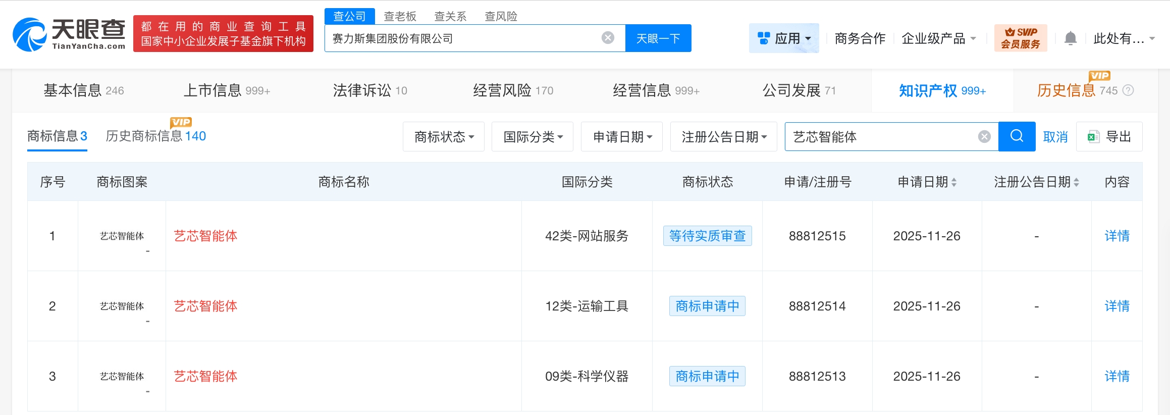 雷达财经讯,天眼查知识产权信息显示,近日,赛力斯集团股份有限公司申请注册3枚“艺芯智能体”商标,国际分类为科学仪器、运输工具、网站服务,当前商标状态均为等待实质审查。 赛力斯集团股份有限公司成立于2007年5月,法定代表人为张正萍,注册资本约16.3亿人民币,经营范围含制造、销售汽车零部件、机动车辆零部件、普通机械、电器机械、电器、电子产品等。股东信息显示,该公司由重庆小康控股有限公司、东风汽车集团有限公司、重庆渝安汽车工业有限公司等共同持股。