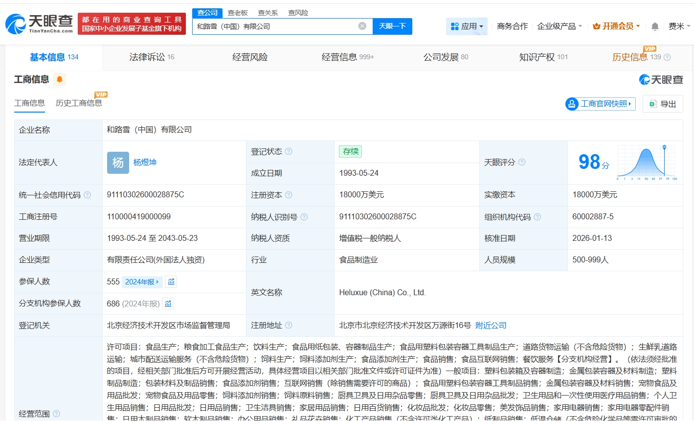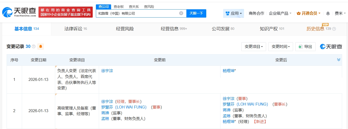 雷达财经讯,天眼查工商信息显示,近日,和路雪(中国)有限公司发生工商变更,徐宇淙由法定代表人、经理、董事长改任董事,杨煜坤接替法定代表人、经理,罗慧芬(LOH WAI FUNG)接任董事长。 和路雪(中国)有限公司成立于1993年5月,注册资本1.8亿美元,经营范围包括食品生产、粮食加工食品生产、饮料生产等。股东信息显示,该公司由梦龙投资(上海)有限公司全资持股。