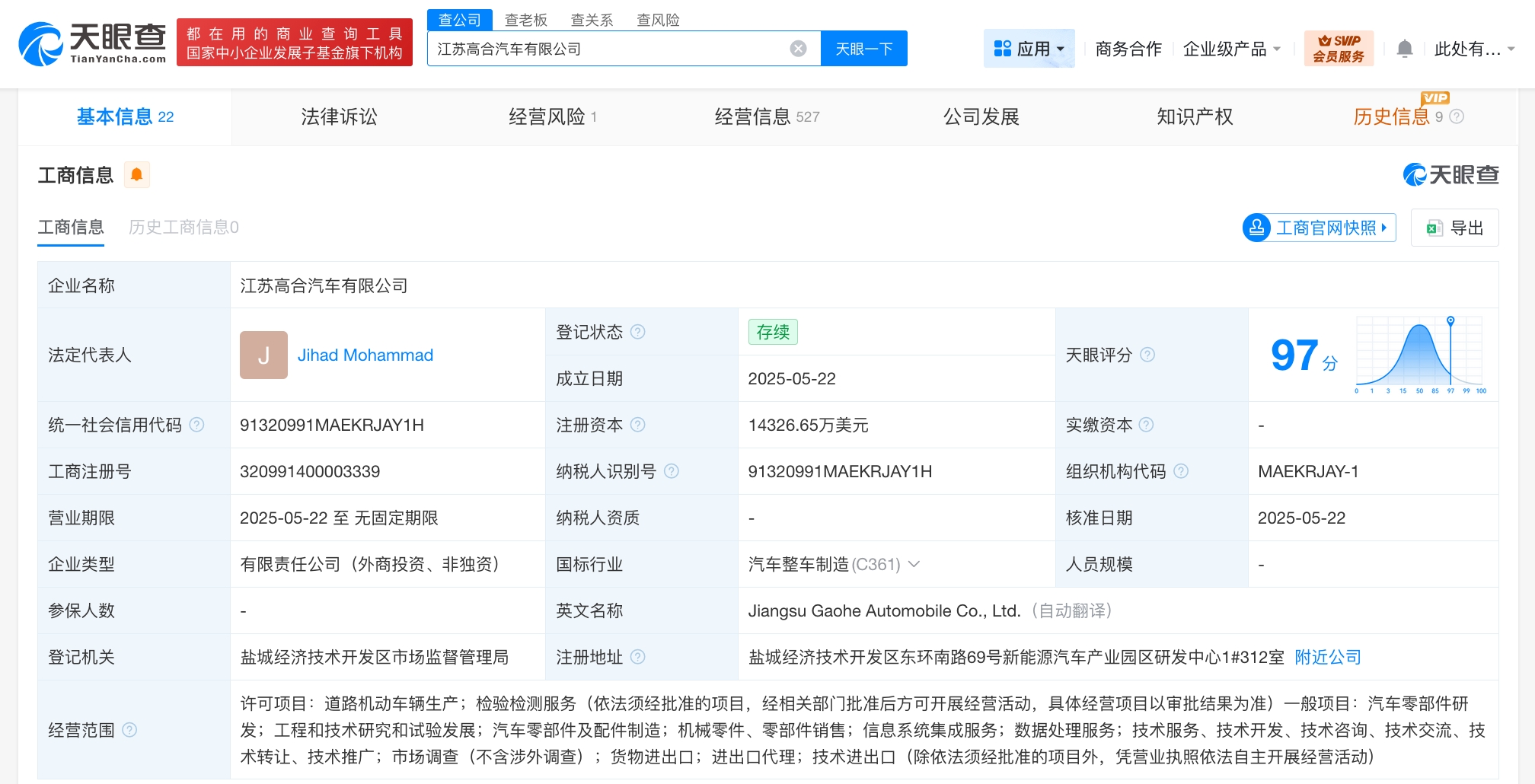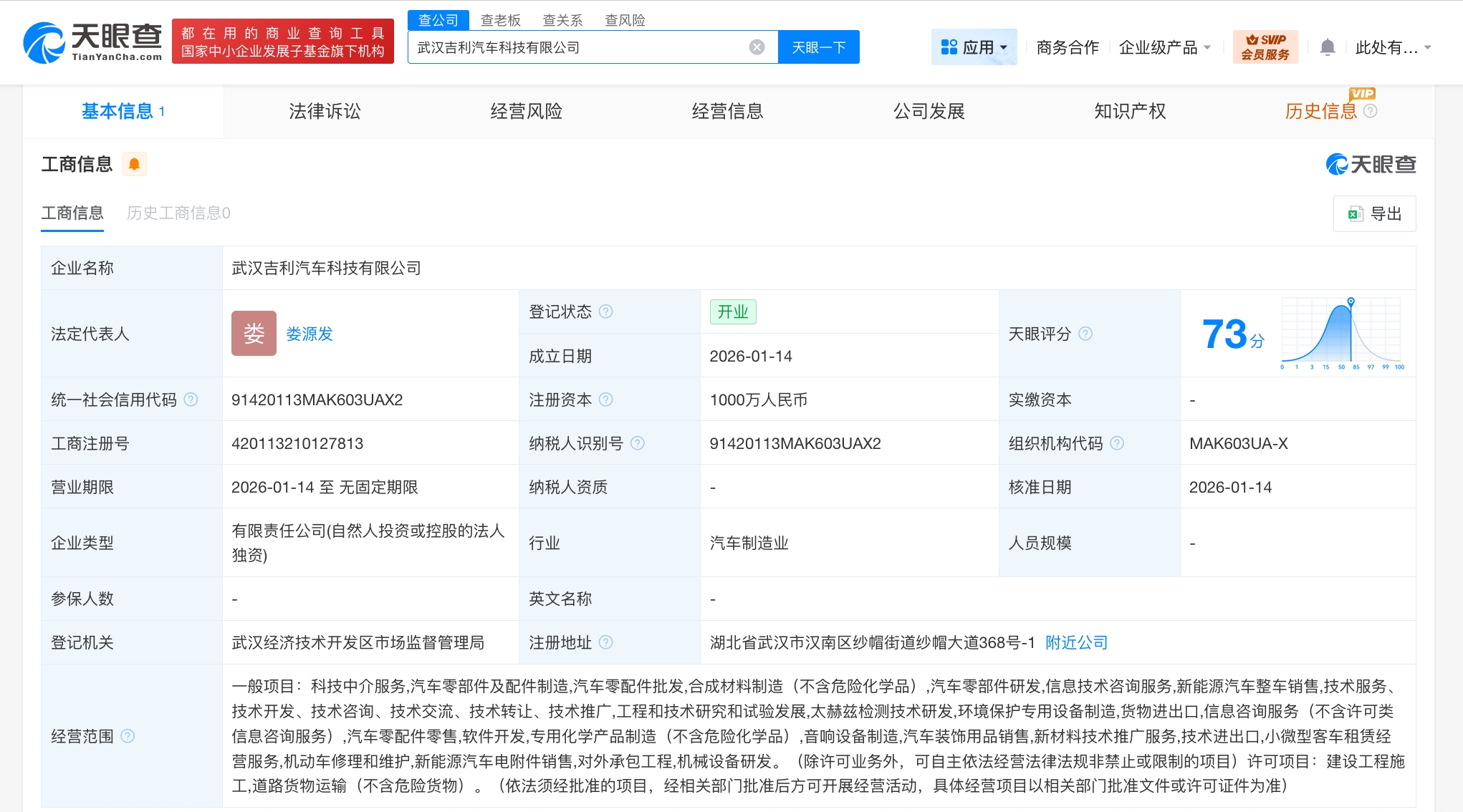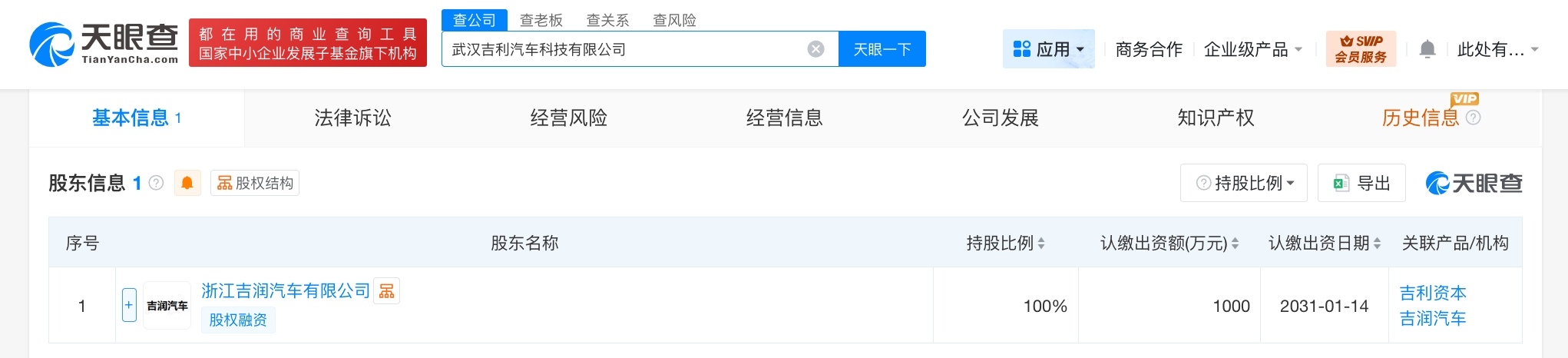 雷达财经讯,天眼查工商信息显示,近日,武汉吉利汽车科技有限公司成立,法定代表人为娄源发,注册资本1000万人民币,经营范围含科技中介服务、汽车零部件及配件制造、汽车零配件批发、合成材料制造、汽车零部件研发、信息技术咨询服务、新能源汽车整车销售等。股东信息显示,该公司由浙江吉润汽车有限公司全资持股。