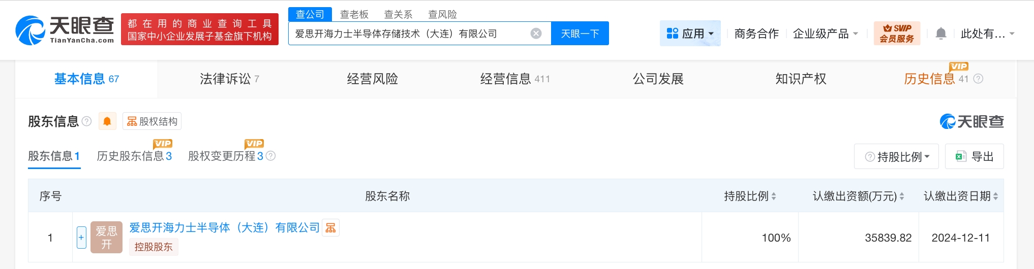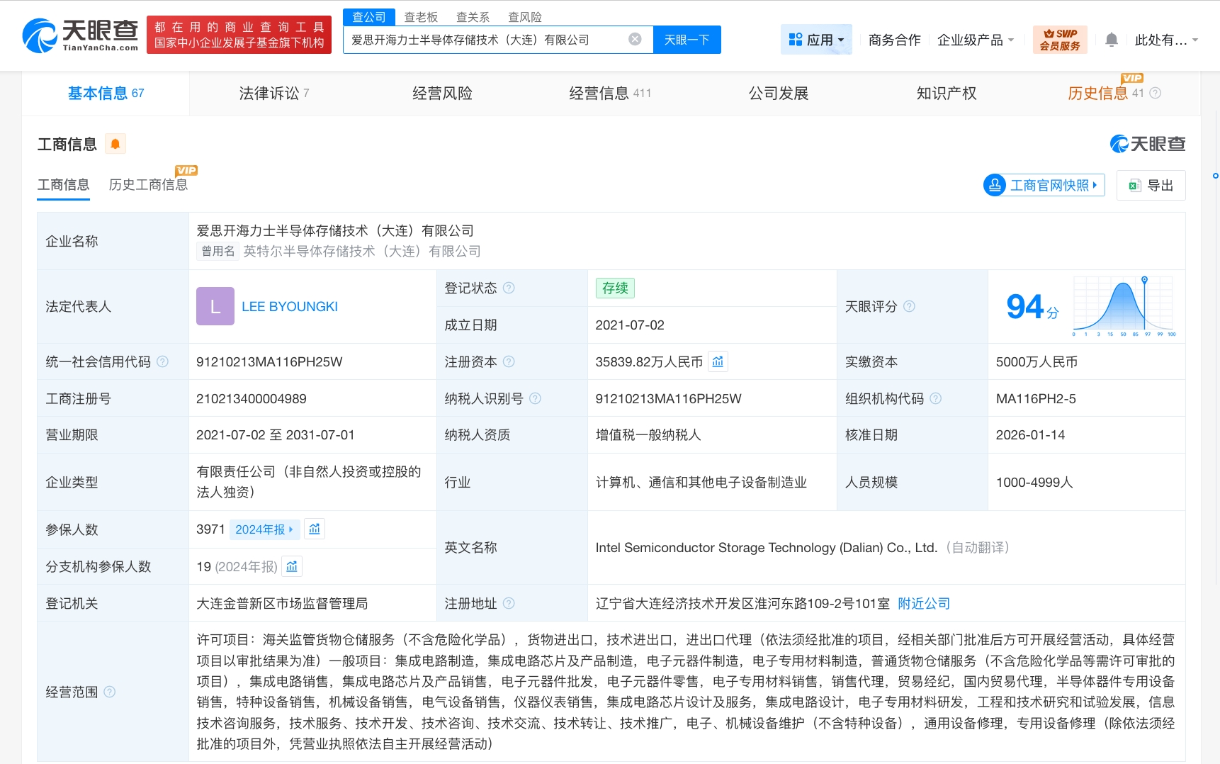 雷达财经讯,天眼查工商信息显示,近日,爱思开海力士半导体存储技术(大连)有限公司发生工商变更,KIM YOUNG-SIK卸任法定代表人、董事长,由LEE BYOUNGKI接任,同时,多位高管发生变更。 爱思开海力士半导体存储技术(大连)有限公司成立于2021年7月,注册资本约3.6亿人民币,经营范围含海关监管货物仓储服务、货物进出口、技术进出口、集成电路制造、集成电路芯片及产品制造、电子元器件制造等。股东信息显示,该公司由SK海力士旗下爱思开海力士半导体(大连)有限公司全资持股。