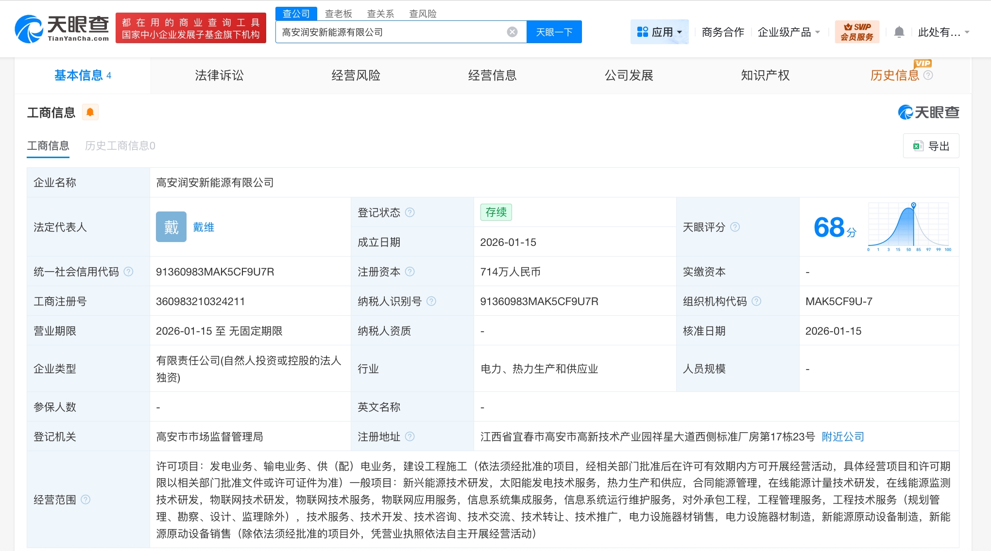 雷达财经讯,天眼查工商信息显示,近日,高安润安新能源有限公司成立,法定代表人为戴维,注册资本714万人民币,经营范围含发电业务、输电业务、供(配)电业务,建设工程施工,新兴能源技术研发,太阳能发电技术服务,热力生产和供应,物联网技术服务,信息系统集成服务等。股权全景穿透图显示,该公司由时代绿色能源有限公司全资持股,后者为宁德时代(300750)全资子公司。