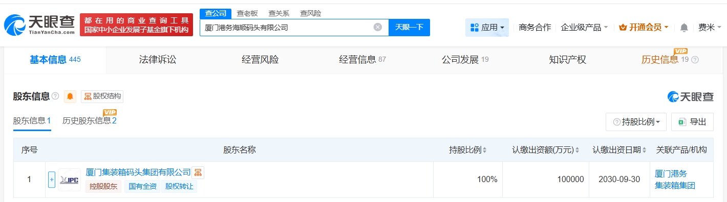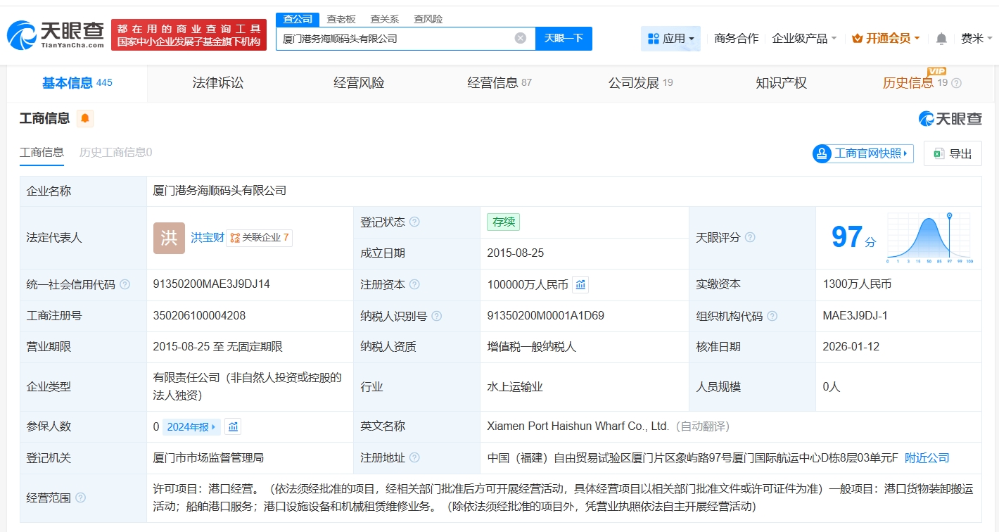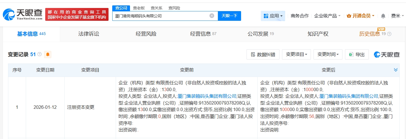 雷达财经讯,天眼查工商信息显示,近日,厦门港务海顺码头有限公司发生工商变更,注册资本由1300万人民币增至10亿人民币,增幅约7592%。 厦门港务海顺码头有限公司成立于2015年8月,法定代表人为洪宝财,经营范围为港口经营、港口货物装卸搬运活动、船舶港口服务、港口设施设备和机械租赁维修业务。股东信息显示,该公司由厦门集装箱码头集团有限公司全资持股。